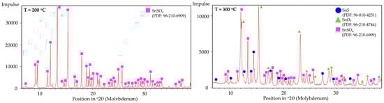XRD peaks of fixed-bed isothermal experimental products from (left) T = 200 °C to (right) T = 300 °C.