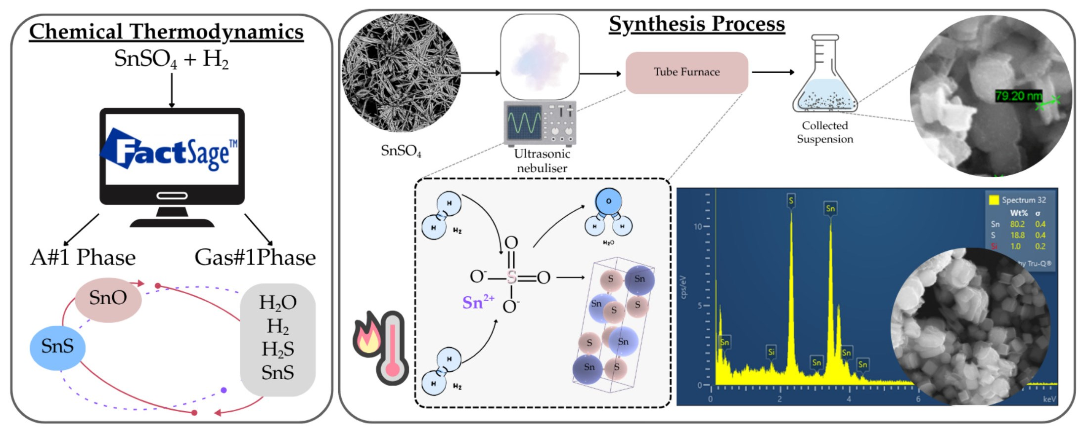 In step 1, precursor solution droplets can be generated either through liquid atomisation by high velocity air or through ultrasonic atomisation without air. Although ultrasonic atomisation suffers from low throughput, it possesses the advantage of narrow drop size distribution and, in the case of SnS synthesis, also the absence of oxidising atmosphere from air. By altering the frequency of the atomiser, ultrasonic spray pyrolysis (USP) has the advantage of using precursor aerosol or precursor “mists” as input to the heated chamber. The application of USP for the preparation of nanoparticles has been widely reported for various types of materials including Ag, Ni, Co, TiO