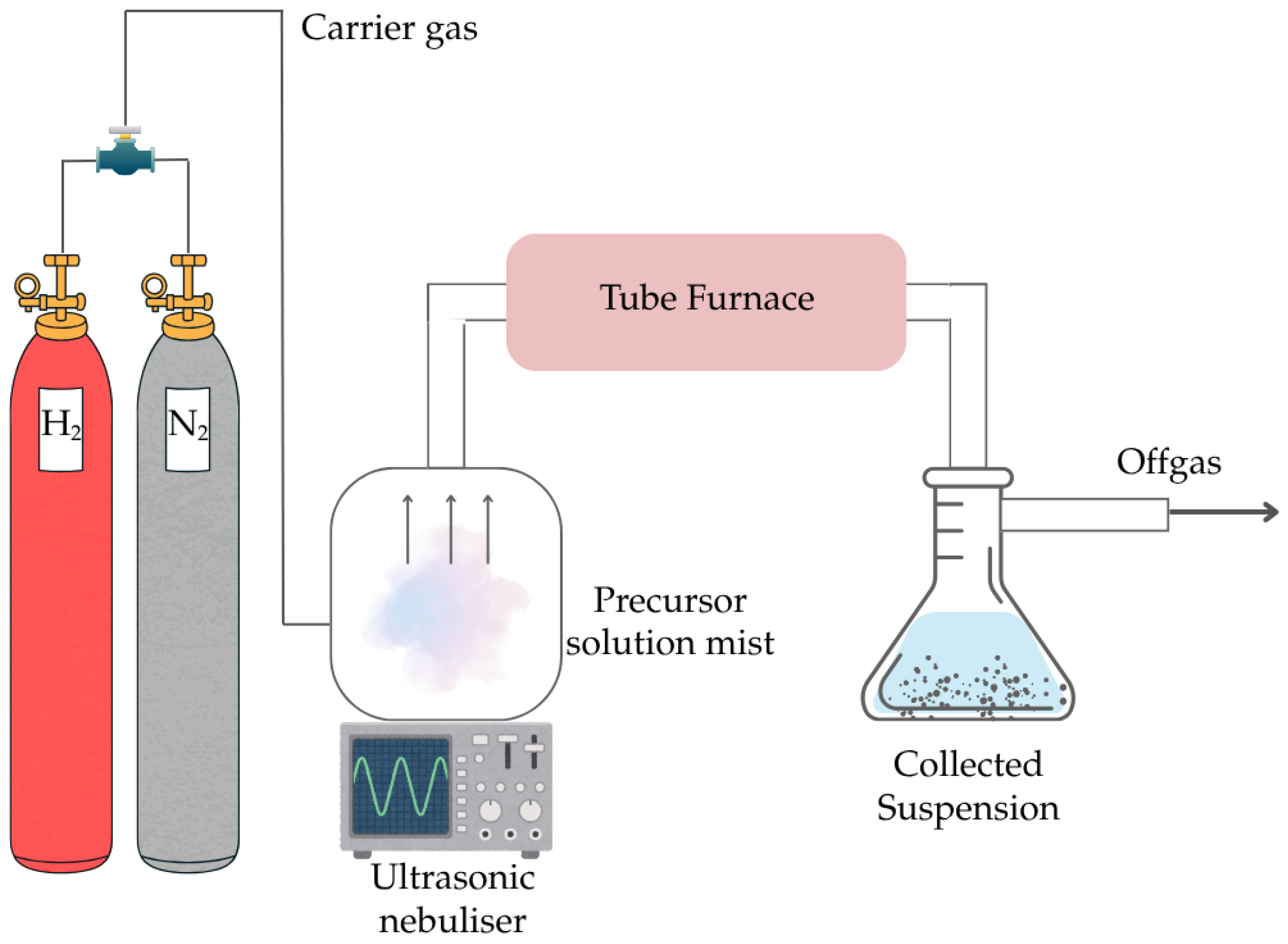 Figure 1, the carrier gas used to transport the atomised precursor solution can be either inert gas such as Ar, N