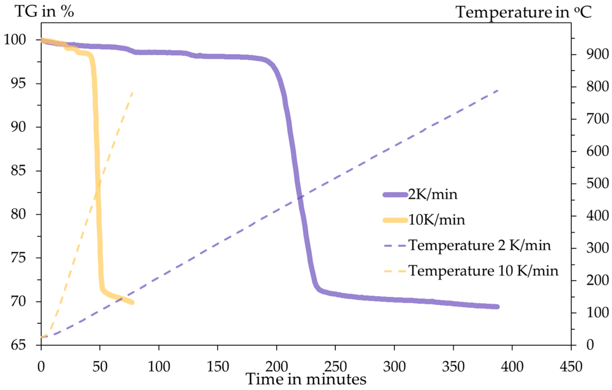Thermogravimetry diagram and temperature programme with respect to time.