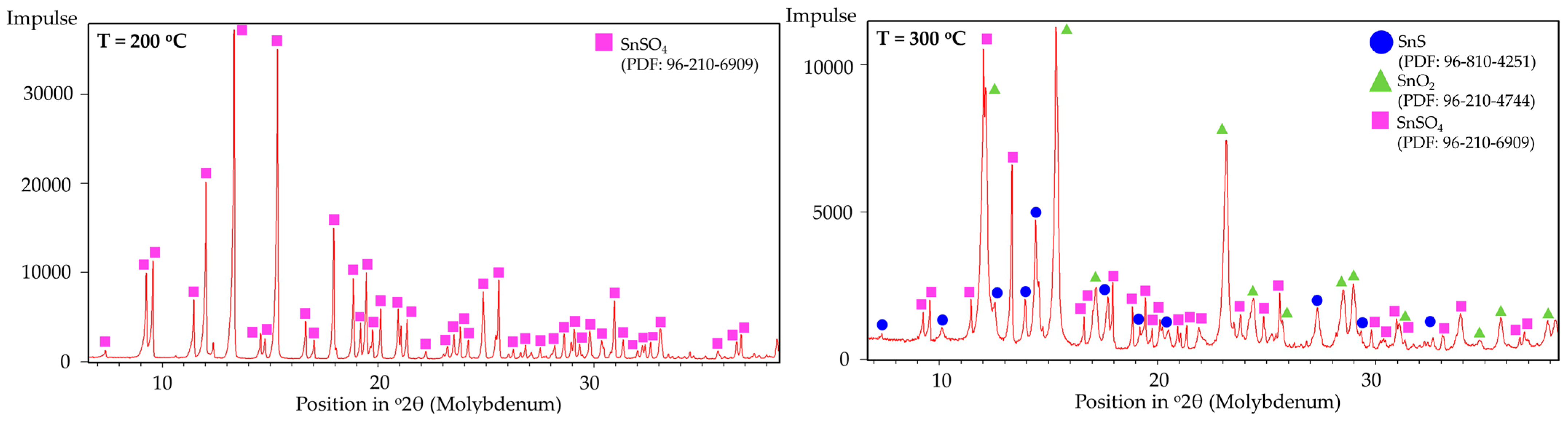 - Kamkui, H.M.; Laminsi, S.; Njopwouo, D.; Djowe, A.T. Deep Insight in Thermal Synthesis of Tin Disulphide microplates, starting from Tin Sulphate and Sulphur: Growth Mechanism Based on Lux Flood’s Theory of Acid and Base. Chalogenide Lett. 2014, 11, 219–226. [Google Scholar]