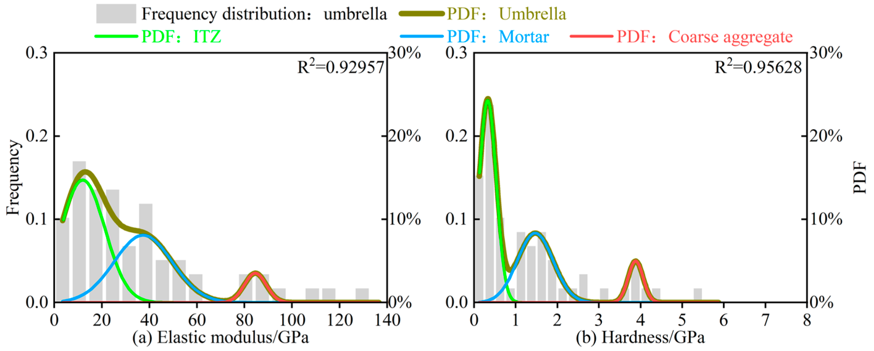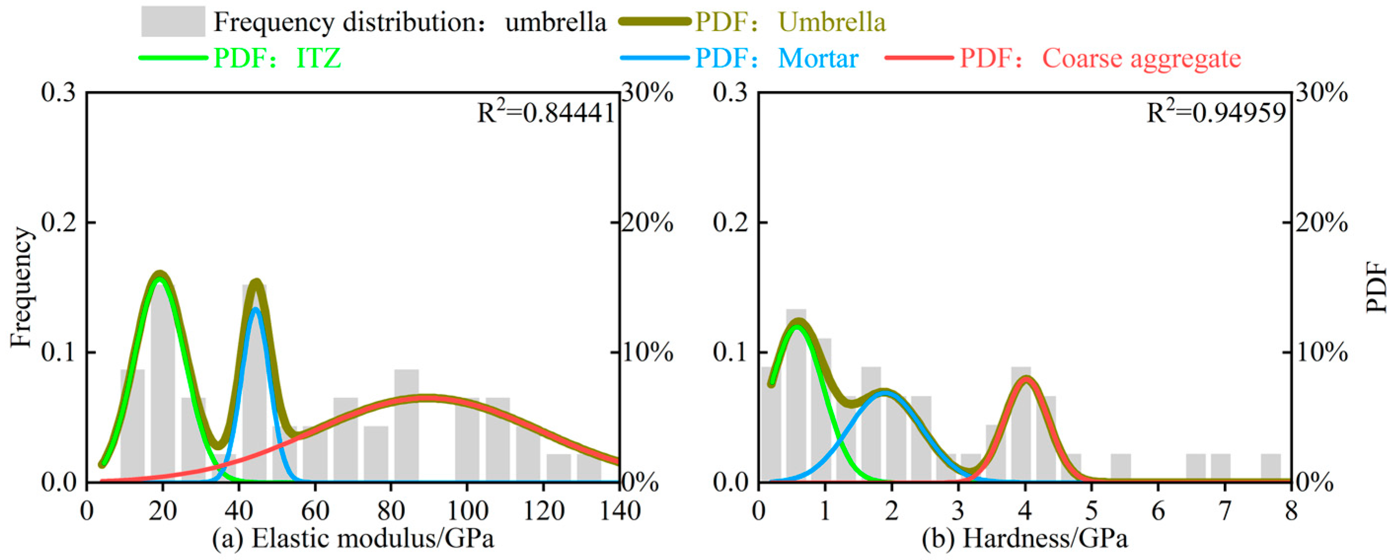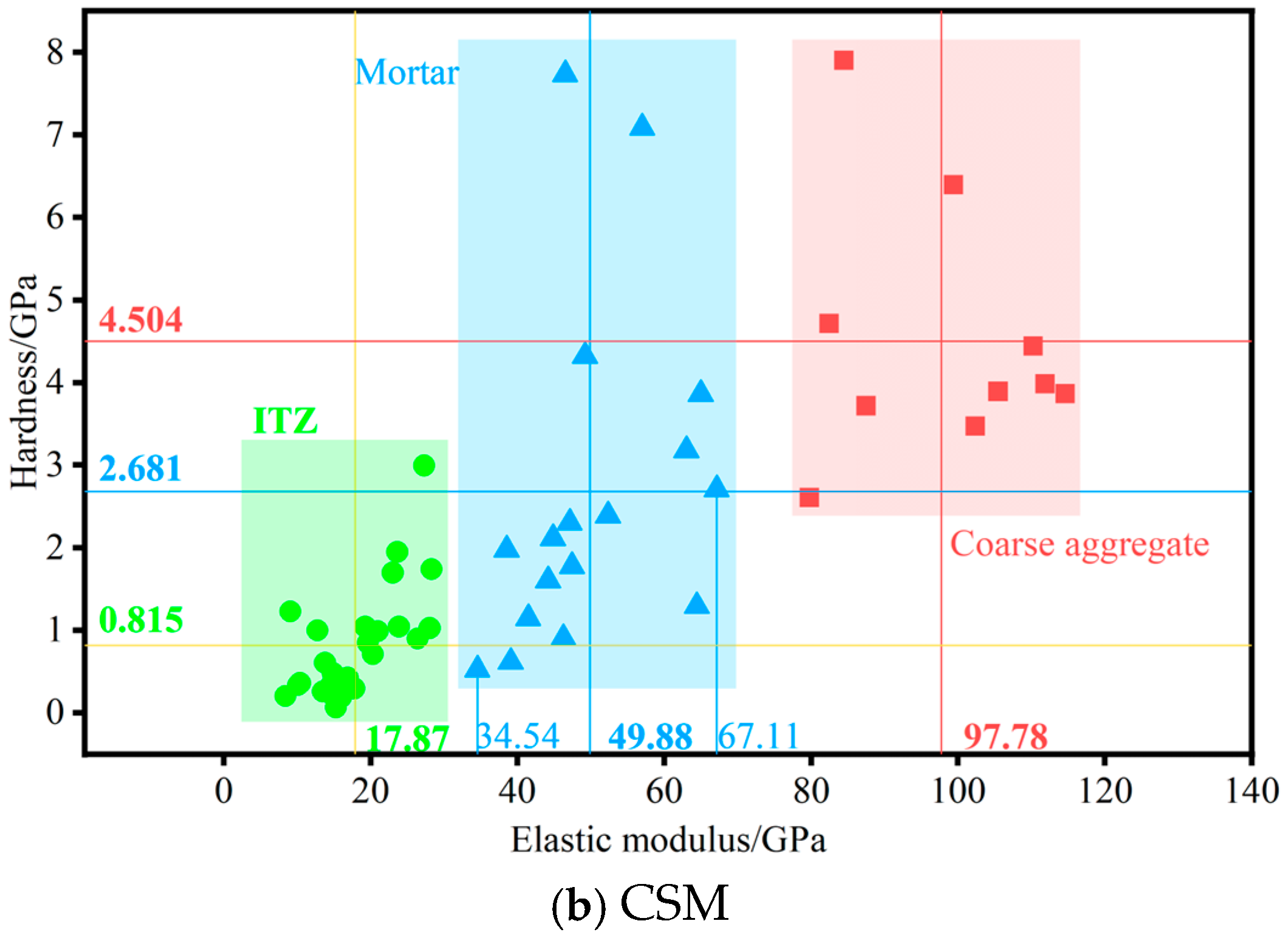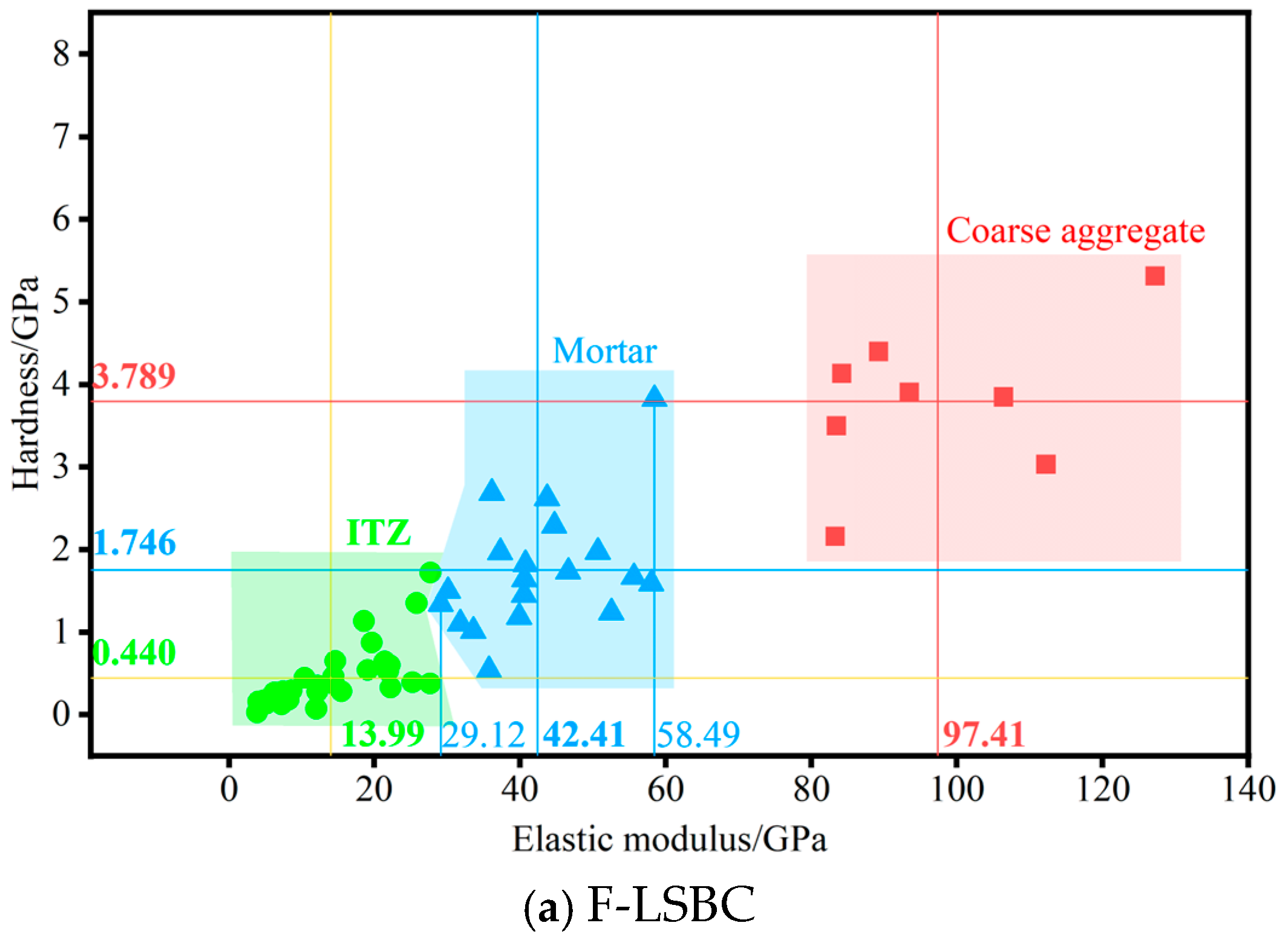 - Nanoindentation and statistical analysis revealed that the ITZ in F-LSBC exhibits significantly lower elastic modulus and hardness, higher porosity, and greater thickness (55–90 μm) than that in CSM. These interfacial weaknesses are the primary cause of the observed mechanical degradation.