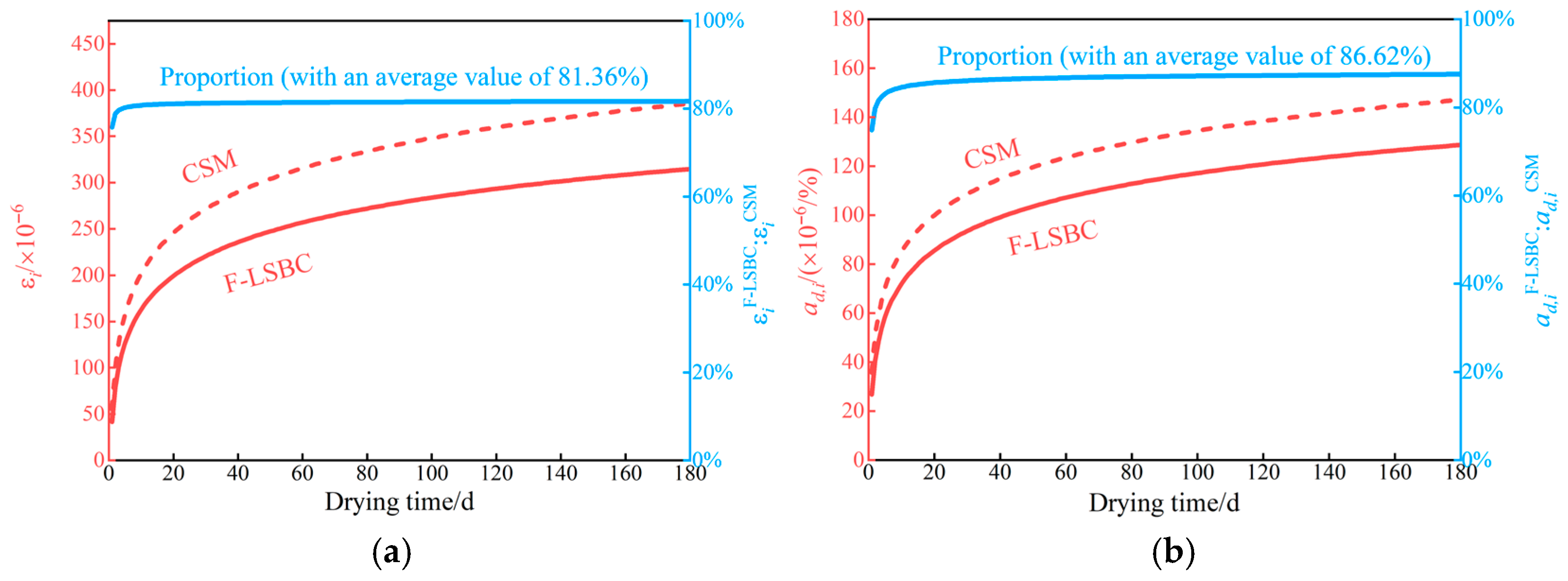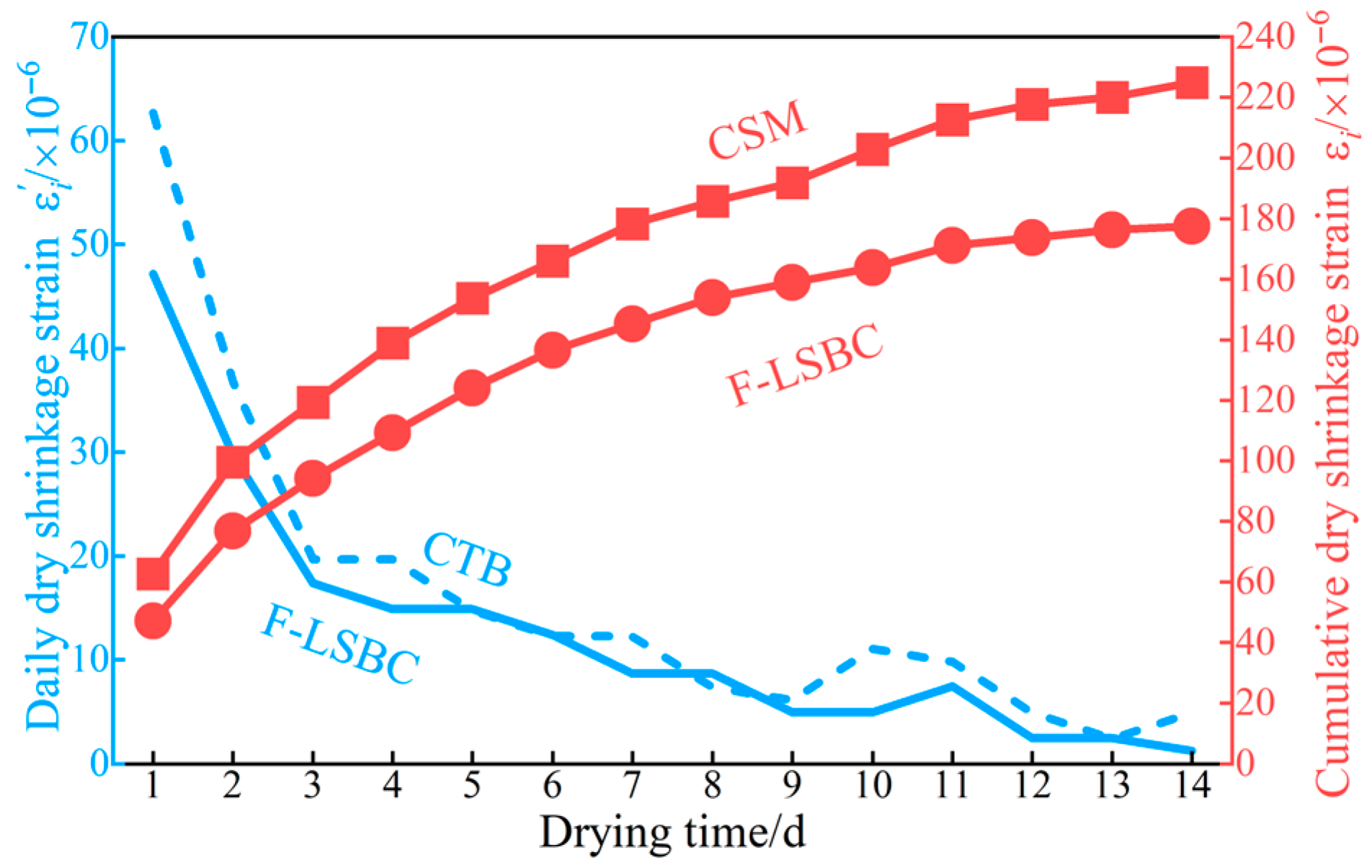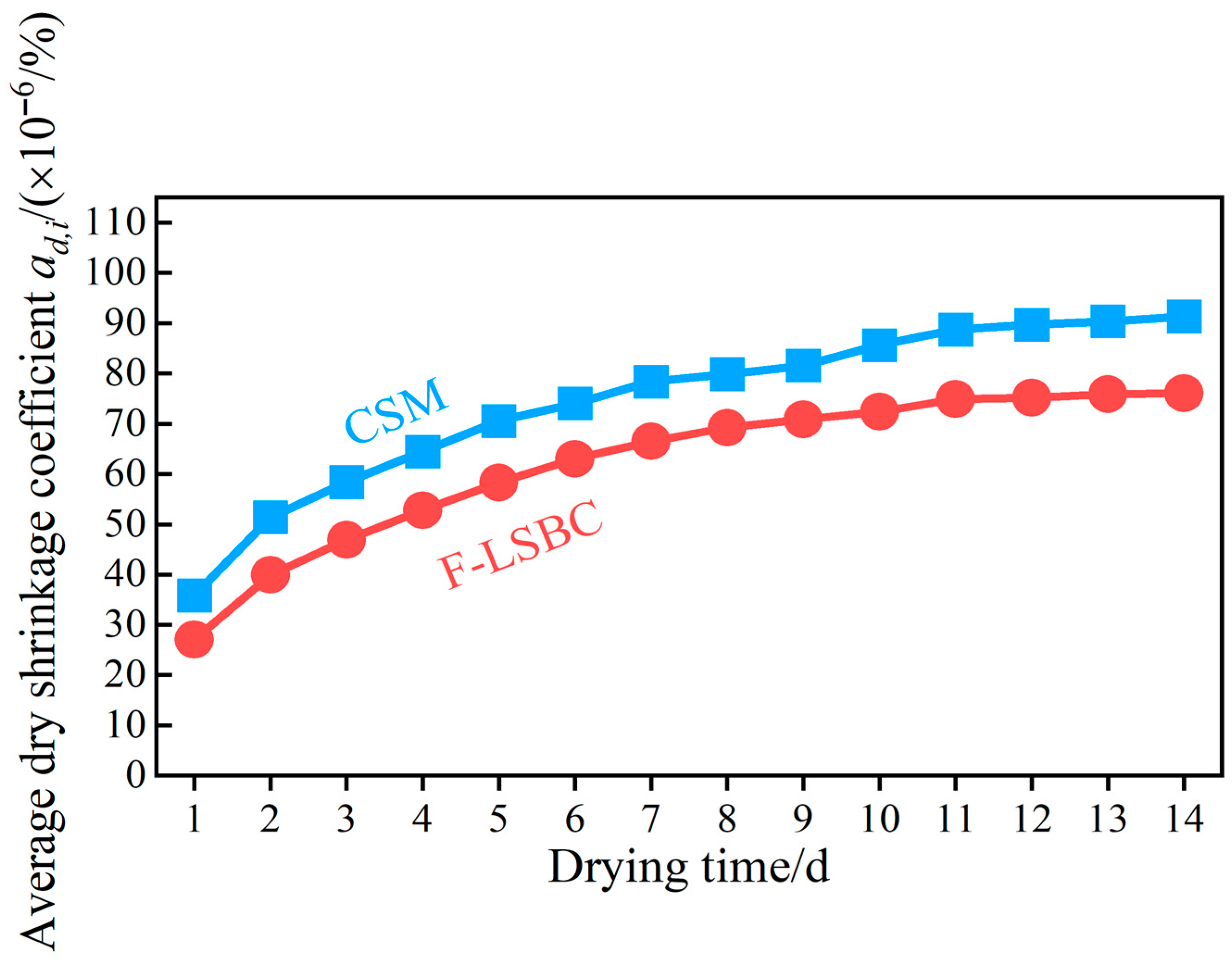 - Despite weaker strength, F-LSBC benefits from a high coarse aggregate content and a weak interface-induced “crack-without-displacement” mechanism, which effectively reduces drying shrinkage strain and delays shrinkage development.