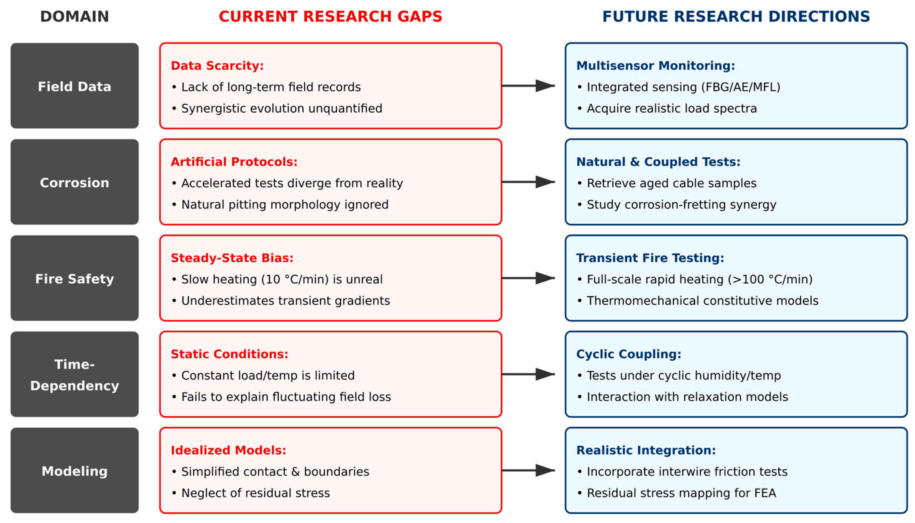 - Conduct full-scale transient fire tests on large-diameter cables with heating rates exceeding 100 °C/min. Record radial and axial temperature distributions, thermal torsion, real-time prestress evolution, and post-fire residual mechanical properties simultaneously. Develop validated thermomechanical constitutive relationships for nonuniform rapid heating conditions. Establish unified post-fire assessment criteria to ensure the safe reuse of cable-supported structures.