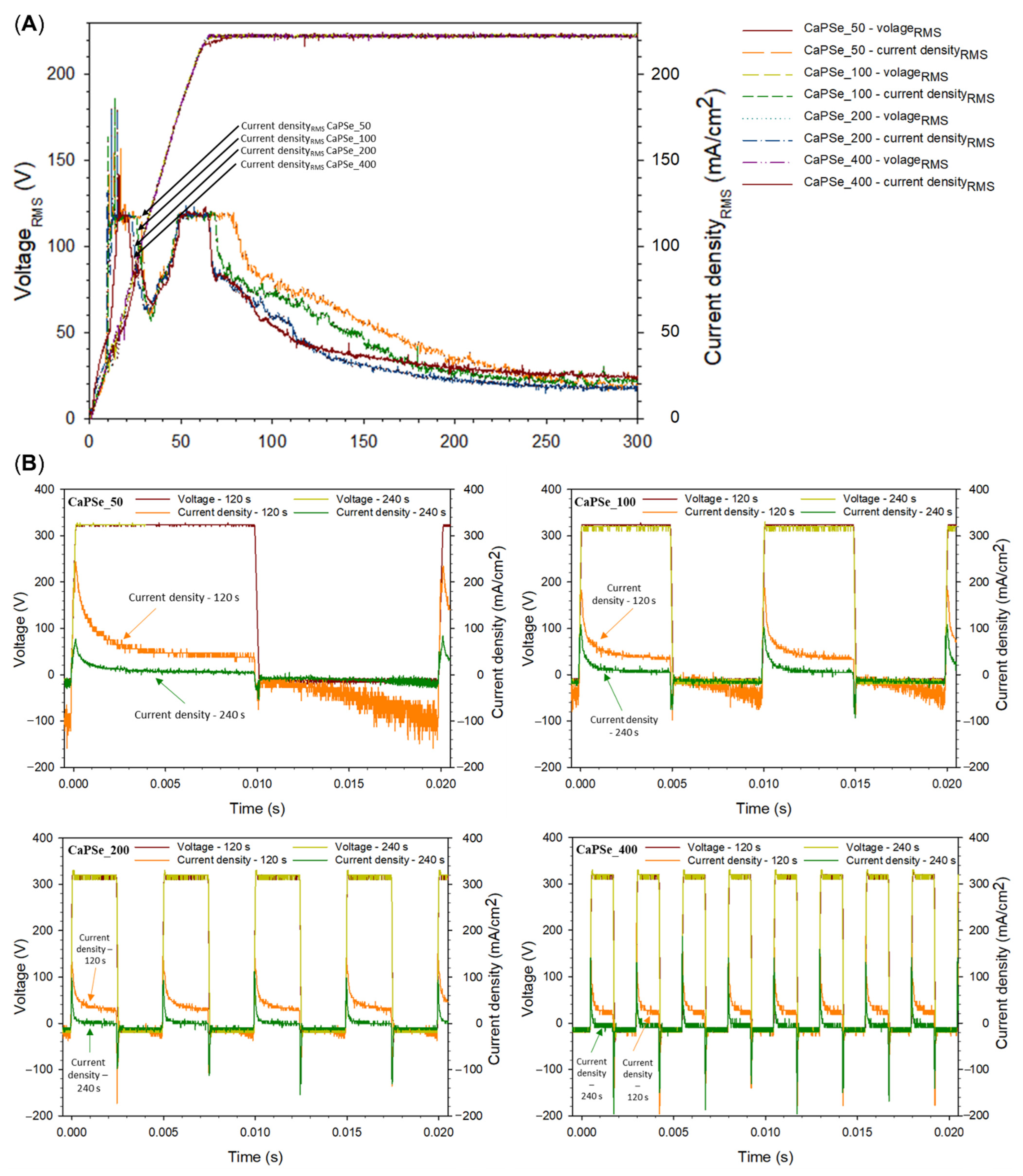 3.1. Voltage–Current Behavior in AC-MAO Coatings Treatments