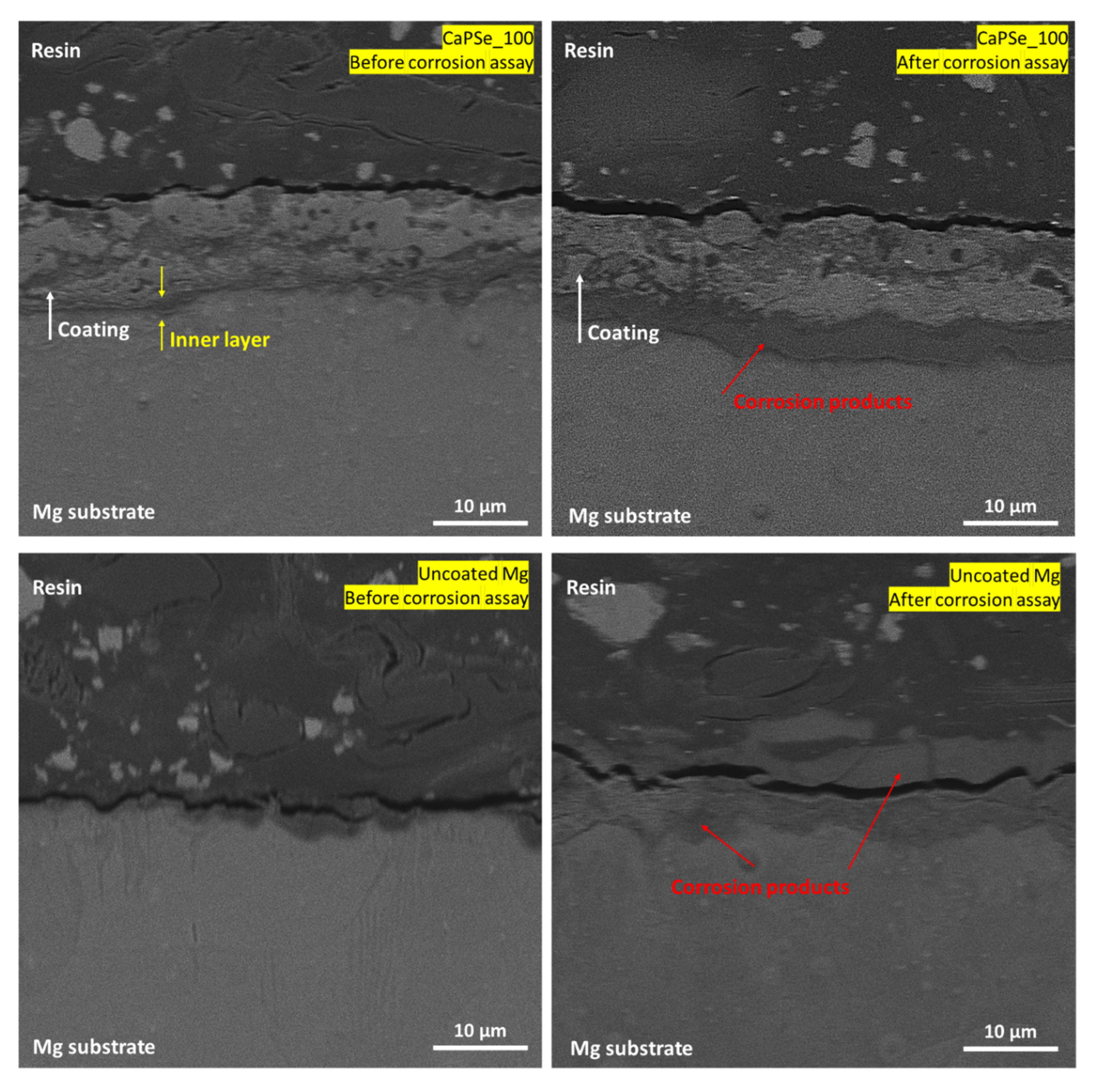 - CaPSe_100 achieved a degradation rate of ~0.012 mm/year vs. ~5.50 mm/year for bare Mg.