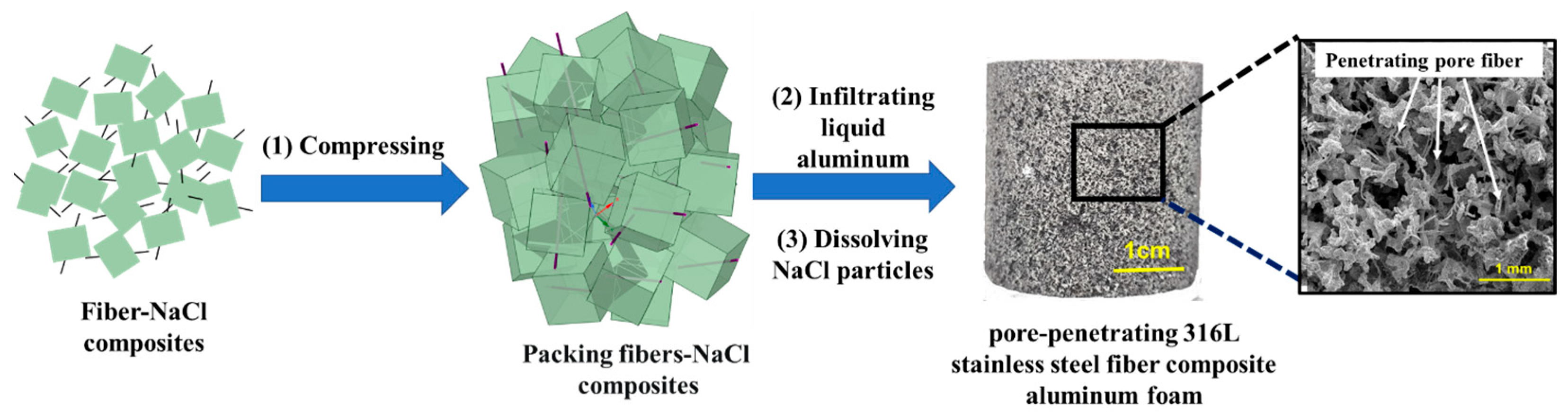 - Wan, T.; Liang, G.; Wang, Z.; Zhou, C.; Liu, Y. Fabrication and Compressive Behavior of Open-Cell Aluminum Foams via Infiltration Casting Using Spherical CaCl2 Space-Holders. China Foundry 2022, 19, 89–98. [Google Scholar] [CrossRef]