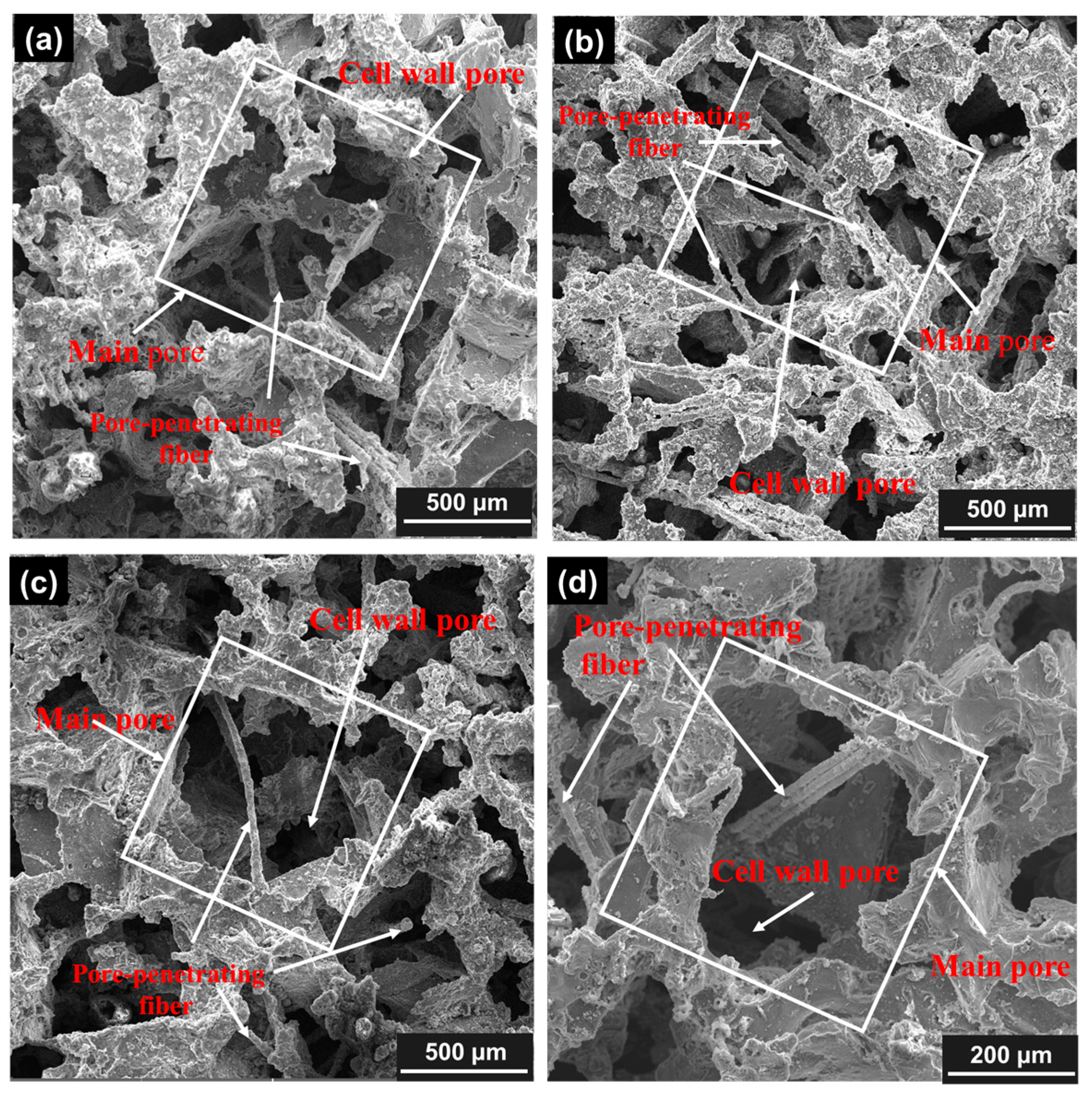 | Samples | Fiber Diameter r/μm | Porosity ϕ/% | Average Main Pore Size D/μm (Standard Deviation σ) | Average Cell Wall Pore Size d/μm (Standard Deviation σ) |