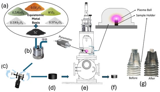 Green compacts were prepared by uniaxial pressing approximately 300 mg of milled powder into disk-shaped pellets (3.5 mm height, 5 mm diameter) under an applied load of approximately 30 MPa. The final HEC pellet mass was approximately 150 mg, reflecting 50% mass loss due to oxide-to-carbide reduction. The complete experimental sequence is illustrated schematically in Figure 1.