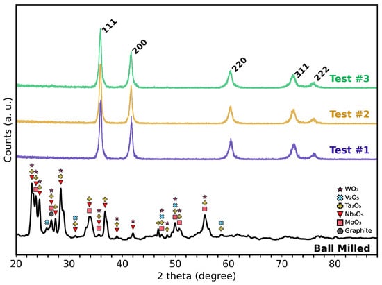 XRD patterns showing the powder after ball milling (performed at ambient temperature). “Test #1” to “Test #3” are the three independently synthesized HEC samples processed via MIHP at approximately 2100 °C. The HEC patterns confirm single FCC phase formation and reproducibility across all test samples.