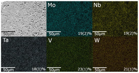 Scanning electron microscopy (SEM) was performed using the Quanta 650 FEG (FEI, Hillsboro, OR, USA), coupled with energy-dispersive X-ray spectroscopy (EDX), and EDX analysis was used to evaluate the surface morphology and elemental distribution in the synthesized samples. As shown in Figure 3, the EDX elemental maps confirm a near-equiatomic distribution of Mo, Nb, Ta, V, and W, consistent with the nominal equimolar design (∼20 at.% each). The measured compositions deviate by no more than at.% from the nominal value, which is within the expected compositional uncertainty derived from propagated measurement errors during EDX analysis.