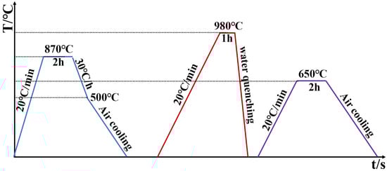 The heat treatment comprised three stages. First, the specimen was heated to 870 °C, held for 2 h, furnace-cooled at 30 °C/h to 500 °C, and finally air-cooled to room temperature. Second, it was reheated to 980 °C, held for 1 h, and then water-quenched. Finally, the specimen was tempered at 650 °C for 2 h. A schematic of the complete heat treatment procedure is provided in Figure 1.
