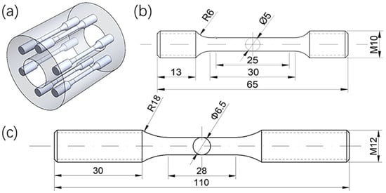 The heat-treated samples (Figure 2a) were subsequently cut into an high-temperature tensile specimen based on the ASTM E21-2009 standard [14] (Figure 2b), and a high-temperature low-cycle fatigue specimen following the ASTM E606/E606M-2012 standard [15] (Figure 2c).