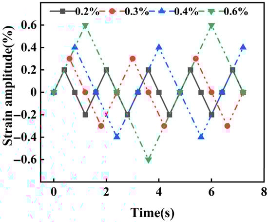 High-temperature low-cycle fatigue tests were performed on an electronic hydraulic servo fatigue testing machine (MTS, NEW 810, Eden Prairie, MN, USA) in accordance with ASTM E606/E606M-2012. The tests were conducted at 700 °C under strain amplitudes of ±0.2%, ±0.3%, ±0.4%, and ±0.6% until specimen fracture (Figure 3). A triangular waveform was applied at a constant strain rate of 0.5%/s, with the strain controlled by a 25 mm extensometer. All tests maintained a mean stress of zero with a strain ratio (R) of −1.