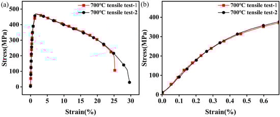 The engineering stress–strain curves. (a) High temperature tensile strength of 30Cr2Ni3MoWV steel at 700 °C, (b) is an enlarged view of strain from 0% to 0.7%.