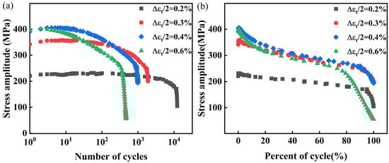 Stress amplitude curve of 30Cr2Ni3MoWV steel under different strain amplitudes. (a) number of cycles, (b) relative cycle.