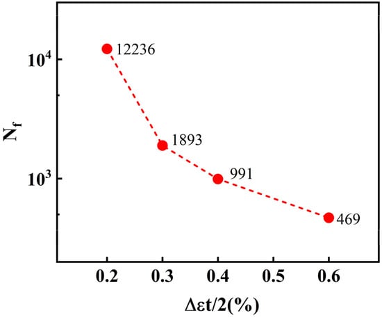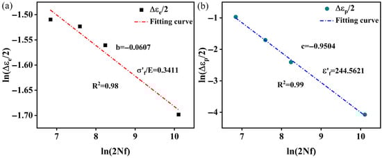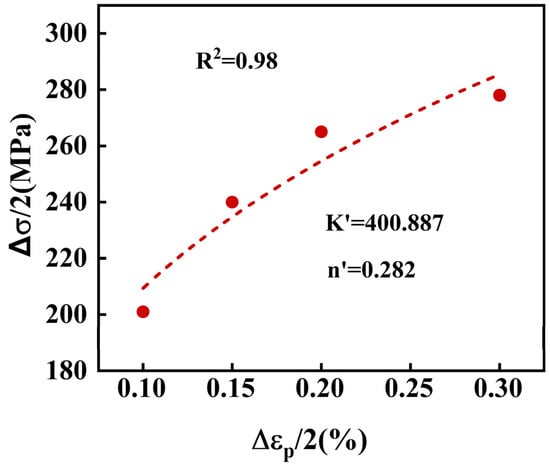Here, and are the cyclic stress amplitude and plastic strain amplitude, respectively [37,38]. They can be obtained from the hysteresis loop at half-life. K′ and n′ are the cyclic strength coefficient and cyclic strain hardening exponent, respectively.