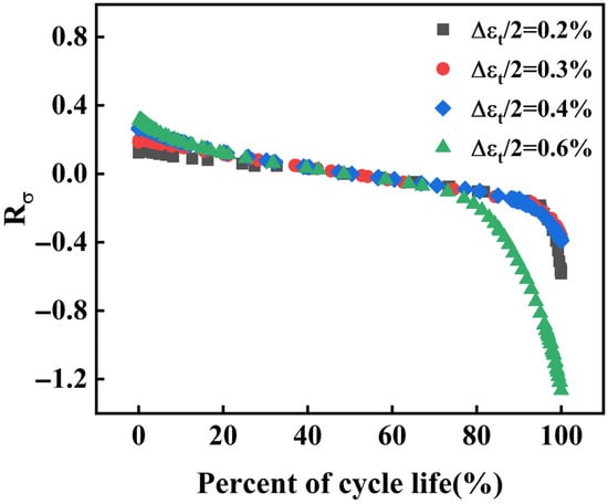 The relationship between and is depicted in Figure 8. It exhibits a nonlinear trend, similar to the stress amplitude curves in Figure 6. The shape of the curve is influenced by the progressive accumulation of fatigue damage. For strain amplitudes ranging from 0.2% to 0.4%, the curves demonstrate a high degree of overlap. However, as the strain amplitude increases to 0.6%, obvious differences in the overlap of the curves are observed. This suggests that as the strain amplitude increases, the decreasing rate of accelerates. Therefore, an increase in strain amplitude results in a more accelerated softening of the material, thereby detrimentally affecting its fatigue resistance.