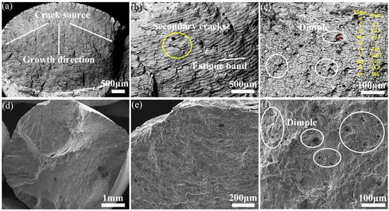 Morphology of low-cycle fatigue fracture expansion zone for 30Cr2Ni3MoWV steel, (a–c) strain amplitude is 0.6%, (d–f) strain amplitude is 0.2%.