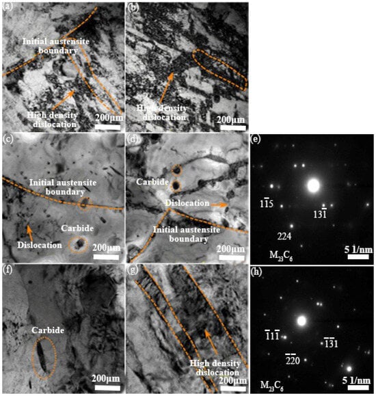 The TEM micrographs of 30Cr2Ni3MoWV steel, both prior to and following fatigue testing, are depicted in Figure 11. The initial lath martensite structure before fatigue testing, with dislocation tangles and cells inside the laths, is exhibited in Figure 11a,b. After fatigue, at a strain amplitude of 0.2%, as shown in Figure 11c,d, there is a significant alteration of the microstructure, with the dissolution of laths and dislocation cells, while precipitates emerge within the grains and at grain boundaries. According to the corresponding selected area electron diffraction (SAED) pattern (Figure 11h), these precipitates are still identified as the M23C6 phase. Early in cycling, dislocation rearrangement and annihilation predominantly contribute to material softening. As cycling continues, carbide precipitation and coarsening, influenced by both the number of cycles and temperature effects, take over, hindering dislocation motion [35,36]. At a strain amplitude of 0.6% Figure 11f,g, the martensitic lath structure is still retained. The corresponding SAED pattern, as shown in Figure 11h, confirms that the precipitates remain M23C6. Compared with the precipitates observed at the lower strain amplitude of 0.2%, these M23C6 carbides are markedly coarser and exhibit significantly larger sizes.