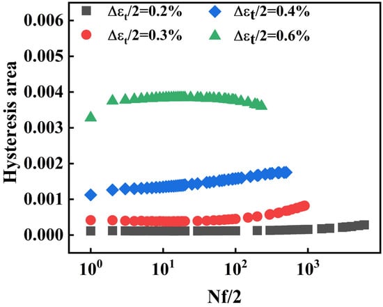 The relationship between the number of cycles to half-life fatigue and the area of the hysteresis loop is shown in Figure 14. It is observed that the area of the hysteresis loop also increases gradually with increasing strain amplitude. At strain amplitudes of 0.2%, 0.3%, and 0.4%, the area of the hysteresis loop remains relatively stable during the initial fatigue loading. However, it subsequently increases gradually, demonstrating cyclic hardening. This excellent resistance to cyclic softening during fatigue is characteristic of 30Cr2Ni3MoWV steel. In contrast, at strain amplitudes of 0.6%, a distinct reduction in the hysteresis loop area is observed, signifying the onset of cyclic softening prior to reaching half-life.