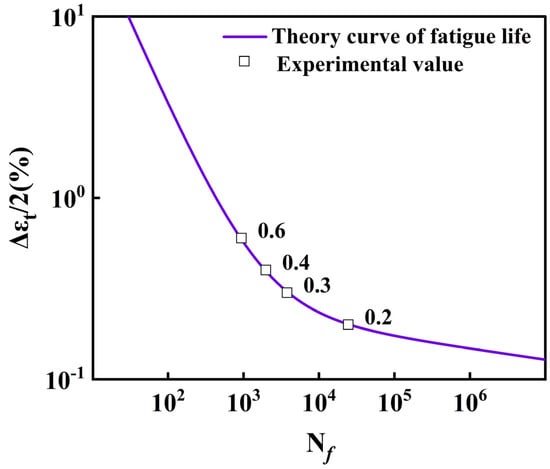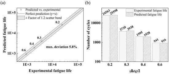 The Coffin–Manson relationship (Equation (8)) was fitted to the four measured fatigue data at strain amplitudes of 0.6%, 0.4%, 0.3%, and 0.2%. As shown in Figure 16, the fitted curve passes accurately through the experimental points. A direct comparison between experimental and predicted lives is provided in Figure 17, where all points fall well within a factor of 1.2 in a scatter band, with the maximum relative deviation being only 5.8% [43].