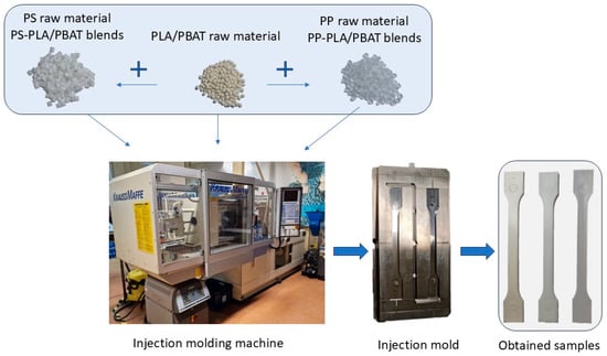 The Krauss Maffei KM65 (Munich, Germany), a hydraulic injection molding machine equipped with a two-cavity insert mold and thermostated with a temperature control system, was used to produce standardized specimens in accordance with PN-EN ISO 294-1 [48] and PN-EN ISO 527-1 [49] standards. The homogenization and mixing process was conducted in the plasticizing unit of the injection molding machine, not in the sense of industrial processes of compounding using twin-screw extruders. Schematic diagram of the process of preparing polymer blends to obtain standardized specimens shown in Figure 1.