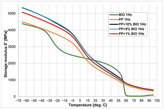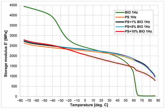 During the mixing of biopolymer with semi-crystalline polymer (polypropylene and amorphous (PS), better results from a practical point of view were obtained for (PP). Even the addition of 1% (BIO) resulted in a visible increase in storage modulus by about 7–9%. Further addition of biopolymer, above 5–10%, did not result in such a significant change. In the case of polystyrene (PS), only the addition of 10% of (BIO) caused a substantial decrease in the storage modulus above the temperature of −20 °C. The obtained results indicate that for (PS), only a biopolymer contamination content above 5% will cause visible differences in the stiffness of the injected parts.