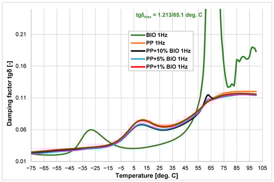 The change in tgδ is presented in Figure 3. The biopolymer shows a very high peak of tgδ at 65.1 °C (corresponding with (PLA) glass transitions), and its effect is only notable in the 5% and 10% mixtures. The glass transition temperature of all mixtures is similar to the value of (PP), ranging between 10.6 °C and 12.0 °C. Analyzing the tgδ course for the (BIO), it can be stated that despite the significant values of this parameter at temperatures of −28 °C (for the (PBAT) component of (BIO) material) and 65 °C (up to 1.221 for (PLA) component), its influence at these temperatures becomes visible only above 5% content. At the same time, the addition of 1% of the (BIO) fraction causes a decrease in the (PP) base damping properties as indicated by the tgδ loss factor.