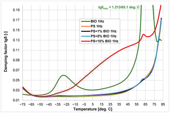 The addition of (BIO) to (PS) causes the stiffness (as indicated by the storage modulus E’) to be maintained, especially above the temperature of −20 °C (Figure 4). In contrast to the storage modulus, the mechanical loss factor tgδ (the damping coefficient) gains a significant value above −20 °C due to the very high tgδ value for (BIO). However, these effects are only visible at the content of 10% (BIO) (Figure 5).