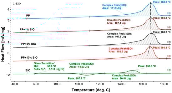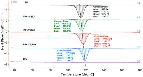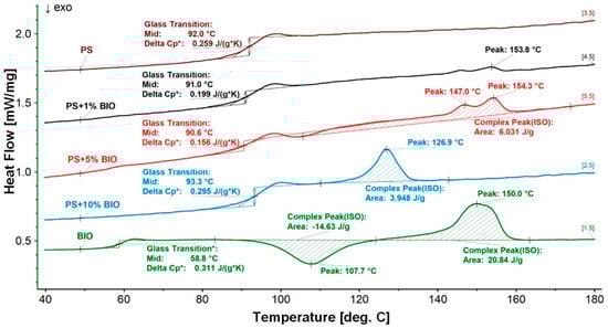 The H-C-H (1st heating–cooling–2nd heating) program was used in the investigations, and the results are presented in the summary charts for all samples in the group of main polymers (PP) and (PS) (Figure 6, Figure 7 and Figure 8). The second heating curves and the cooling phase during which crystallization occurs were selected for analysis. The direction of the exothermic peak is marked on the graphs with an upward arrow. The results were presented in Figure 6 and Figure 7 for (PP) + (BIO) in different contents of (BIO) and in Figure 8 for (PS) + (BIO).