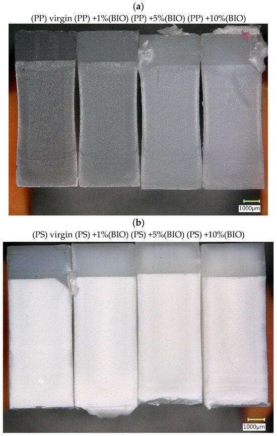For the sample of the (PP) mixtures, it can be observed that even a 1% addition of (BIO) causes a visible lightening of the sample color. For additions of 1% and 5%, the material is evenly distributed throughout the sample mass. Only in the case of a 10% (BIO) addition, a certain swirl or a small area of lack of homogeneity can be observed in the upper part of the sample, just below the notch. For the (PS) mixtures, the samples are even in appearance. However, the addition of 1% (BIO) caused hinge (elastomeric) cracking of the samples, and, similar to the (PP) mixtures, the addition of 10% caused some disturbances in the cracking process.