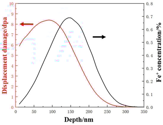Prepared TEM foils with central holes were examined in TEM prior to an ex situ irradiation experiment. The irradiation experiments were carried out at room temperature with 400 keV Fe+ ions in an NEC implanter chamber in the College of Energy at Xiamen University. The irradiation flux was selected as 1.85 × 1012 ions cm−2s−1 and the total fluence was 3.33 × 1015 ions cm−2. SRIM 2008 (stopping and range of ions in matter) is a commonly used software in ion irradiation research for simulating the impact of ions on matter. In this case, a well accepted and recommended Kinchin-Pease model was selected [22]. The Ed of the main elements like Fe, Cr and Ni were set as 40 eV while 25 eV for Al and 60 eV for Mo. With a total fluence of 3.33 × 1015 ions cm−2 at a depth of ~100 nm, an equivalent dose of 8.2 dpa was estimated. As shown in Figure 1, the black curve explained the radiation damage induced by the 400 keV Fe+ ions implanted into PH 13–8 Mo, and the red curve was the implanted Fe+ concentration.