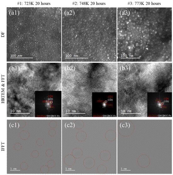 Microstructure of aged samples before irradiation: (a1–a3) DF of samples aged 20 h at 723 K, 748 K and 773 K; (b1–b3) HRTEM and FFT patterns of samples aged 20 h at 723 K, 748 K and 773 K; (c1–c3) IFFT of samples aged 20 h at 723 K, 748 K and 773 K.