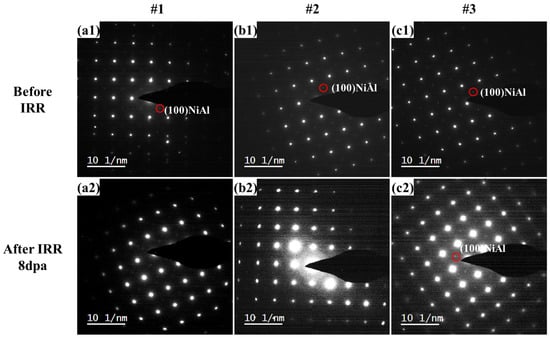 The SAED images of #1, #2 and #3 pre- and post-irradiation were shown in Figure 3. NiAl superlattice reflections were marked with red circles as shown in Figure 3. After 8 dpa irradiation, the NiAl superlattice reflections almost disappeared in samples #1 and #2, suggesting the smaller NiAl precipitates (~2.5 and ~4.9 nm) could have been damaged during the irradiation. However, it is interesting to find the superlattice spots in the SAED result (Figure 3(c2)) for the #3 sample, even though the superlattice diffraction pattern was much weaker, indicating some of the 8.1 nm NiAl precipitates could have been ruined while the rest survived from the irradiation.