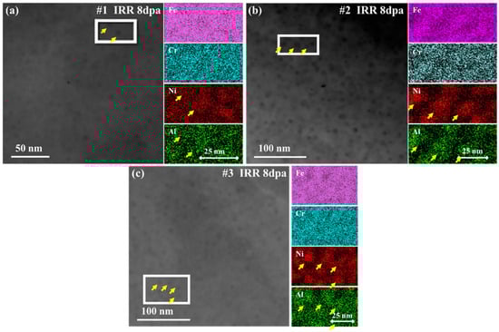 STEM and EDS of irradiated samples, 8 dpa. (a) #1; (b) #2; (c) #3.