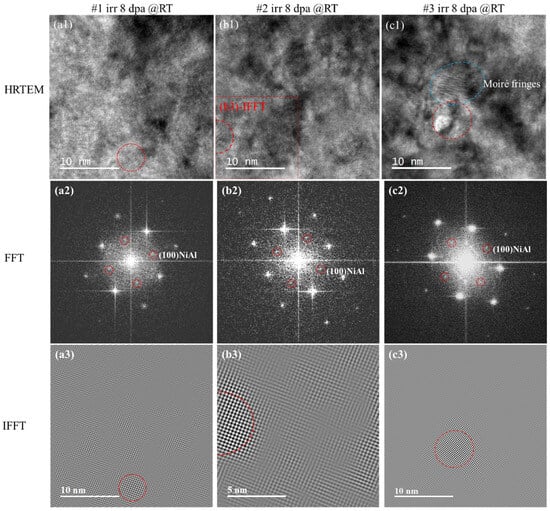 HRTEM images, FFT images and corresponding IFFT images after irradiated 8 dpa: (a1–a3) #1; (b1–b3) #2; (c1–c3) #3. The red circles in the FFT images are the NiAl superstructure spots. The red circles in the IFFT images represent NiAl, and the blue represent Moiré fringes.