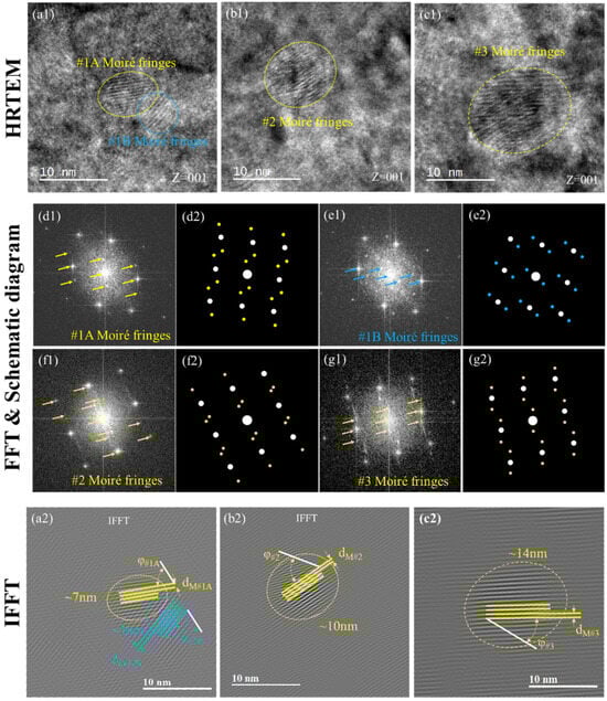 HRTEM, FFT and IFFT of the Moiré fringes of #1, #2 and #3 after 8 dpa: (a–c) HRTEM of #1, #2 and #3; (d1,d2) FFT and the schematic diagram of yellow Moiré fringe in (a); (g1,g2) FFT and the schematic diagram of blue Moiré fringe in (a); for #2 (b,e1,e2); for #3 (c,f1,f2).