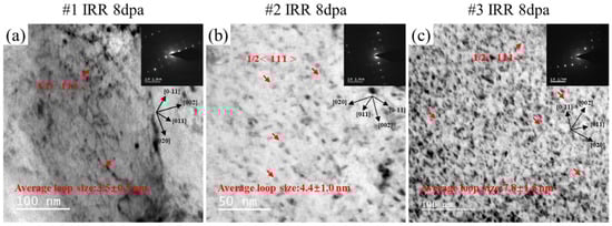 A large number of dislocation loops were found in the two-beam kinematical bright-field (KMBF) TEM image after irradiation, as shown in Figure 7. Figure 7a corresponds to KMBF with g = 002 excited, viewed near the [001] axis of #1 after irradiation. The drawn crystal orientation was marked in the figure and the red arrow marked the a/2<111> dislocation loops. The same analysis method was carried out for the dislocation loop in Figure 7b,c. Generally, because of the low mobility of vacancies at room temperature and the preference for vacancies to aggregate into vacancy clusters, the observable dislocation loops are more likely to be of the interstitial type rather than of the vacancy type. The results are the same as expected, most of the dislocation loops in the irradiated Corrax are a/2<111> dislocation loops. The size of the irradiation-induced dislocation loops of #1, #2 and #3 were analyzed and results show that, under the same irradiation conditions, the average diameters of the dislocation loops in #1, #2 and #3 were 3.5 ± 0.5 nm, 4.4 ± 1.0 nm and 7.8 ± 1.5 while the number density was 6.11 × 1020, 1.17 × 1021 and 1.21 × 1021 m−3 nm, respectively. The size of the dislocation loops increased along with the larger-sized precipitates in the sample.