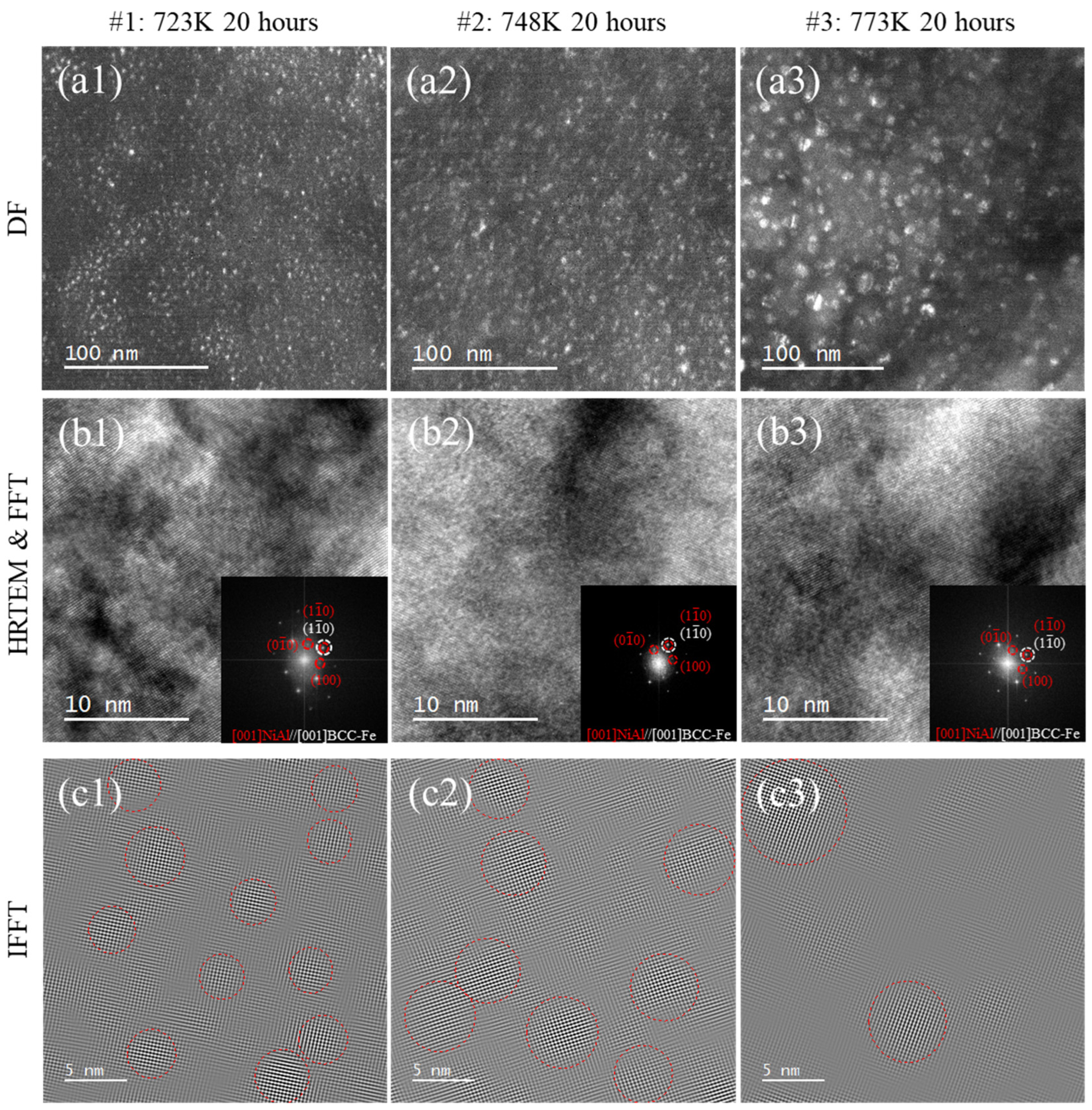 - Before irradiation, controlled state samples thermally aged at 723 K, 748 K and 773 K for 20 h presented uniformly distributed B2 NiAl precipitates in the matrix with sizes of 2.5, 4.9 and 8.1 nm, respectively.