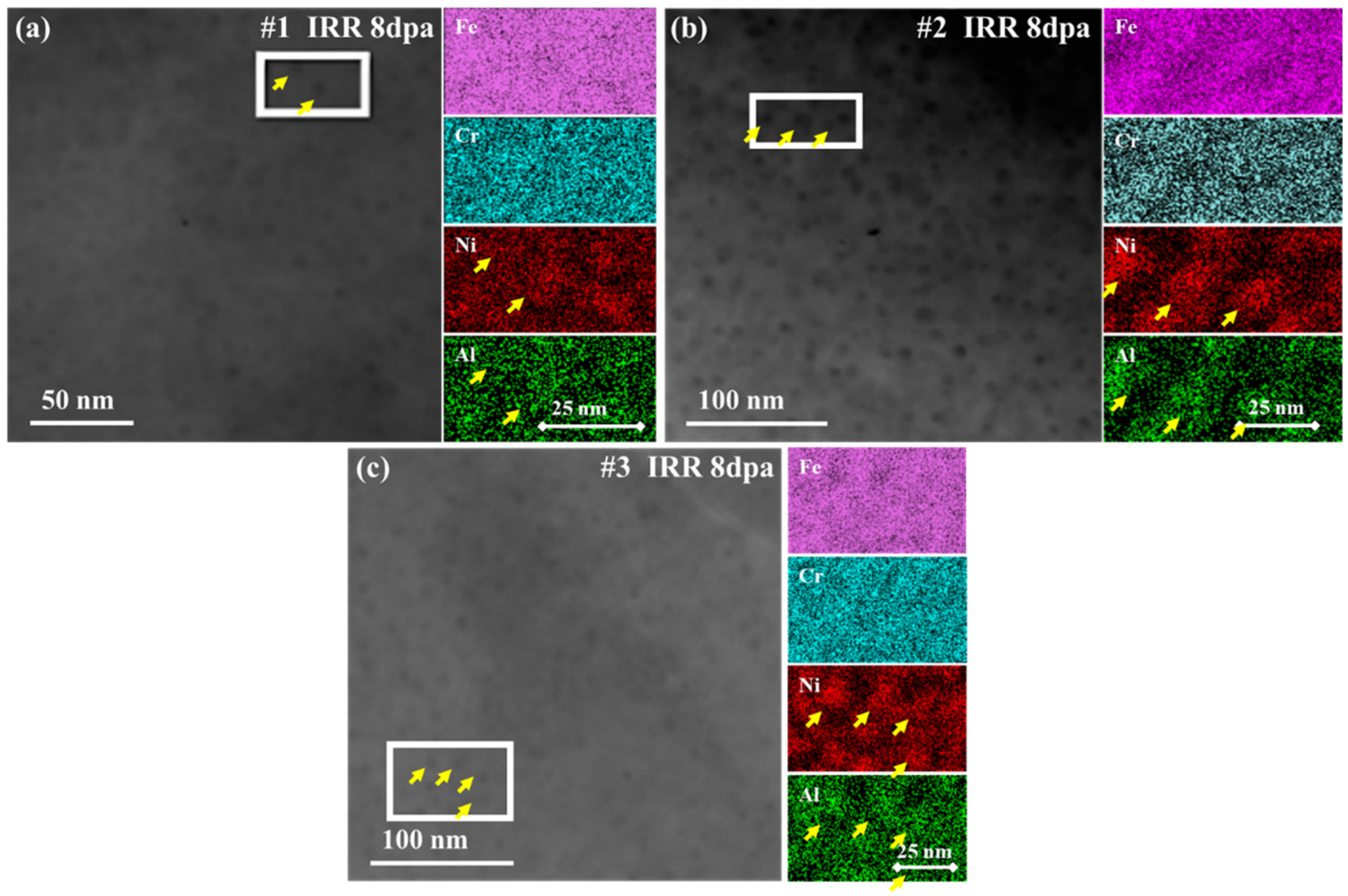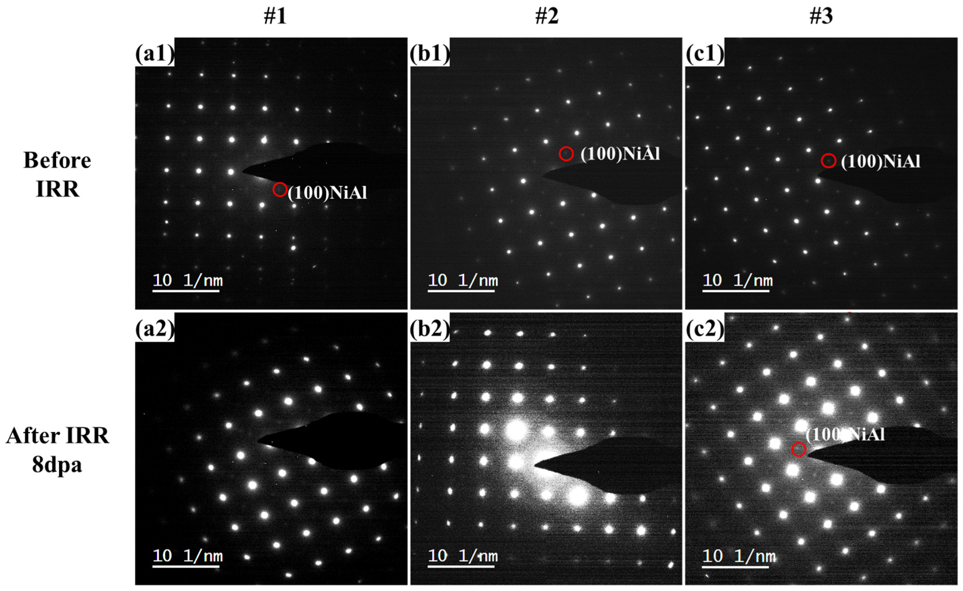 - After irradiation with given conditions, the superlattice diffraction spots of B2 NiAl of smaller size disappeared while the larger ones mostly survived. No elemental diffusion was found by EDS, indicating radiation-induced precipitate disordering is the main reason for radiation dissolution. The variation in superlattices was attributed to the sink strength of the precipitates, and the recoil dissolution was controlled by the critical size 8.1 nm.