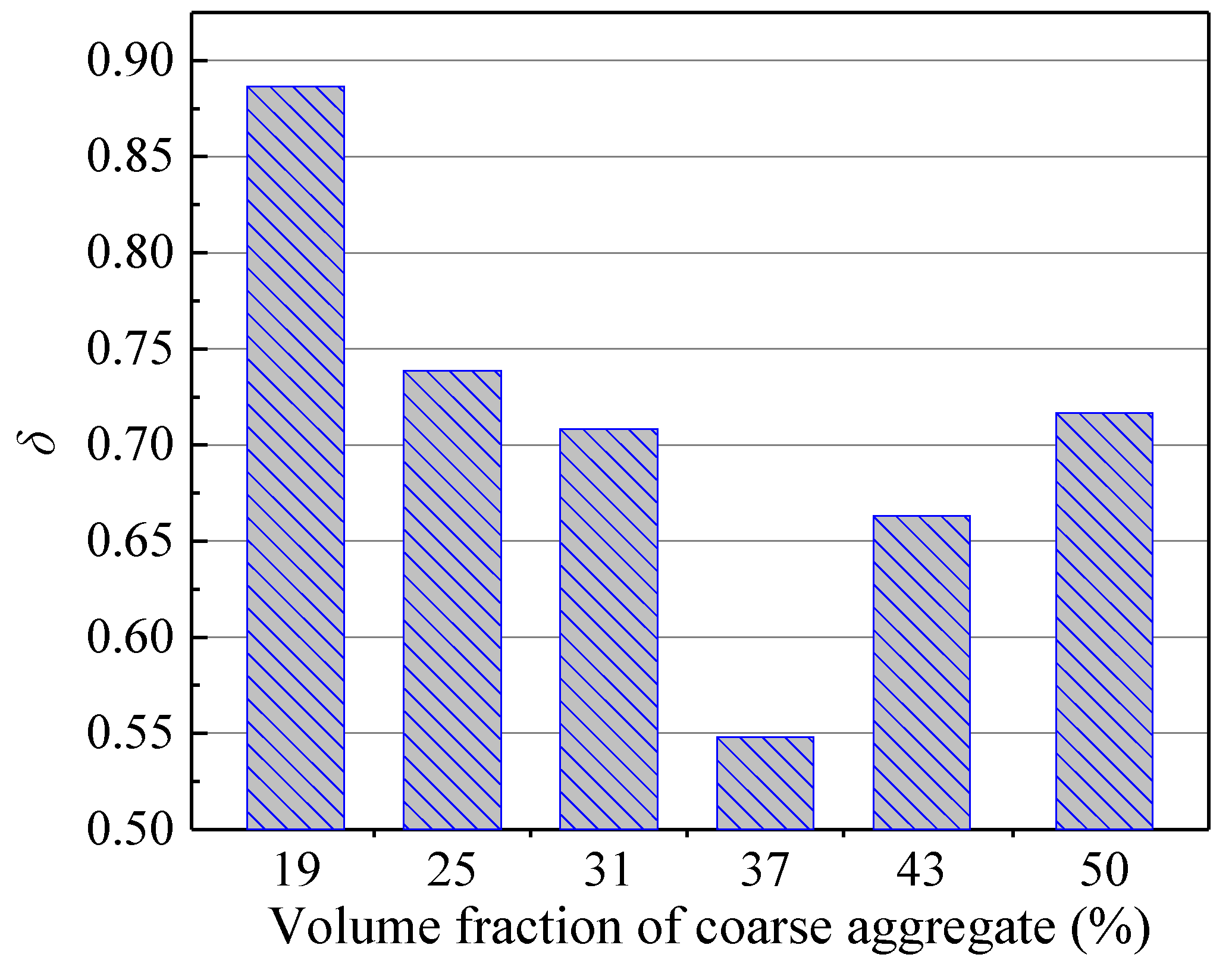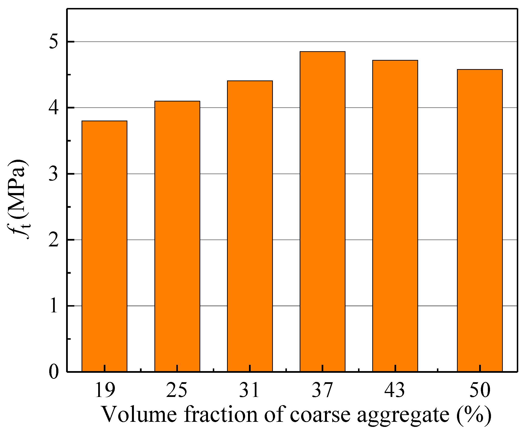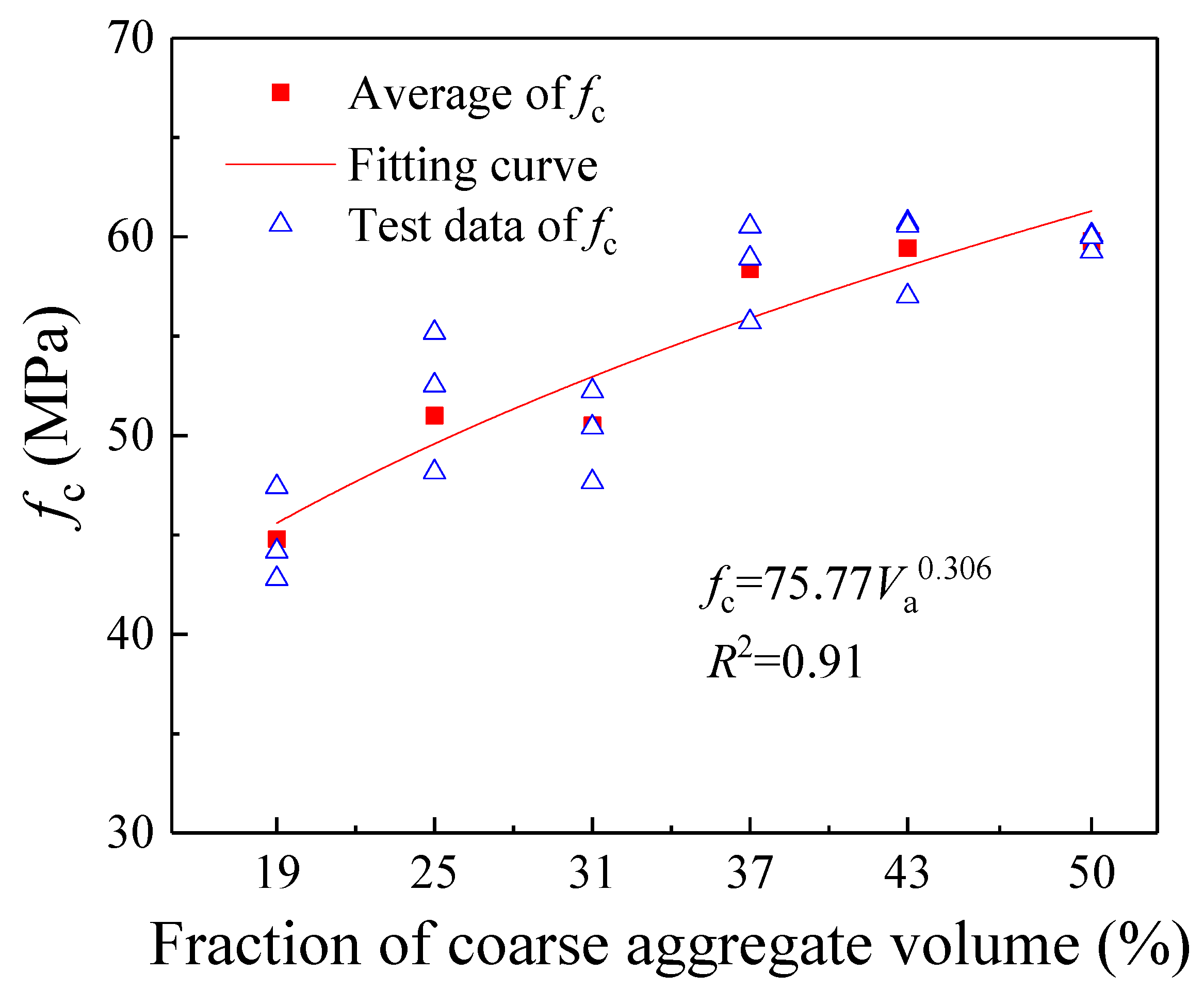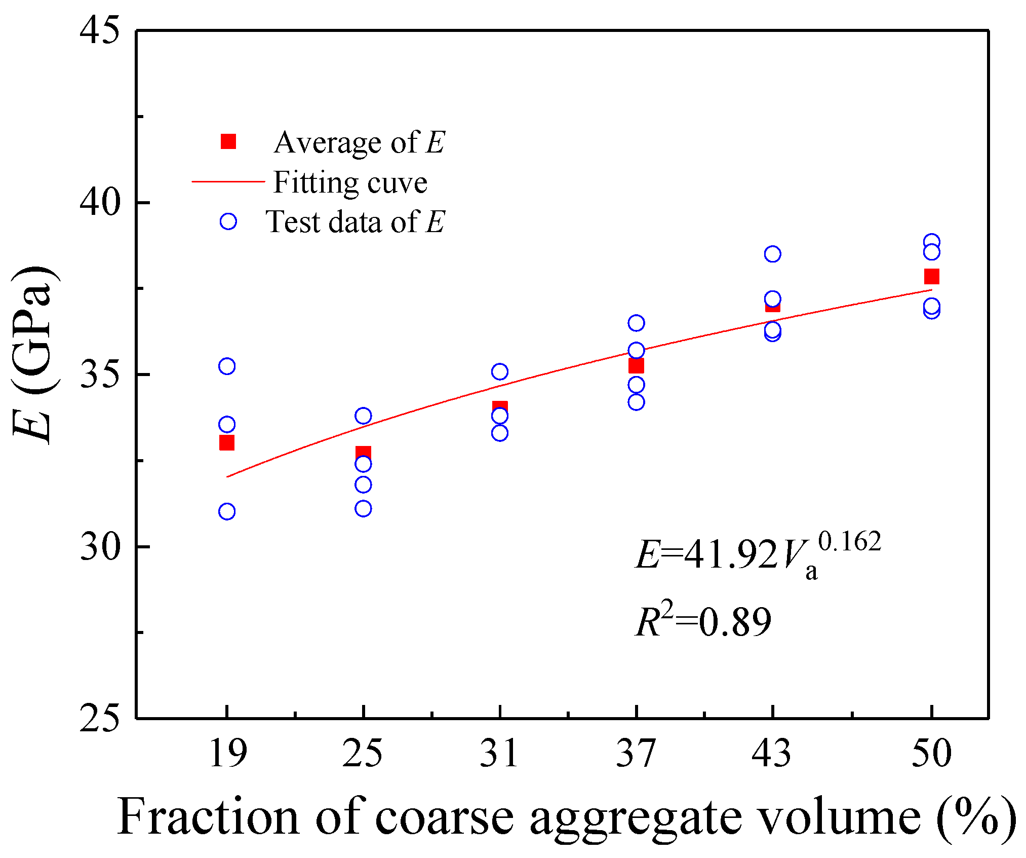 - Influence on Basic Mechanical Properties: Both the compressive strength (fc) and elastic modulus (E) monotonically increase with the increase in Va from 19% to 50%. However, the reinforcing effect of coarse aggregates is more pronounced in the lower Va (19–37%), with a significant 22.12% increase in fc, compared to a marginal 2.43% increase in the higher range (37–50%).