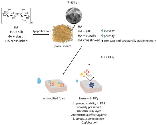 Surface Functionalisation of Hyaluronic Acid-Based Foams with TiO2 via ALD: Structural, Wettability and Antimicrobial Properties Analysis for Biomedical Applications