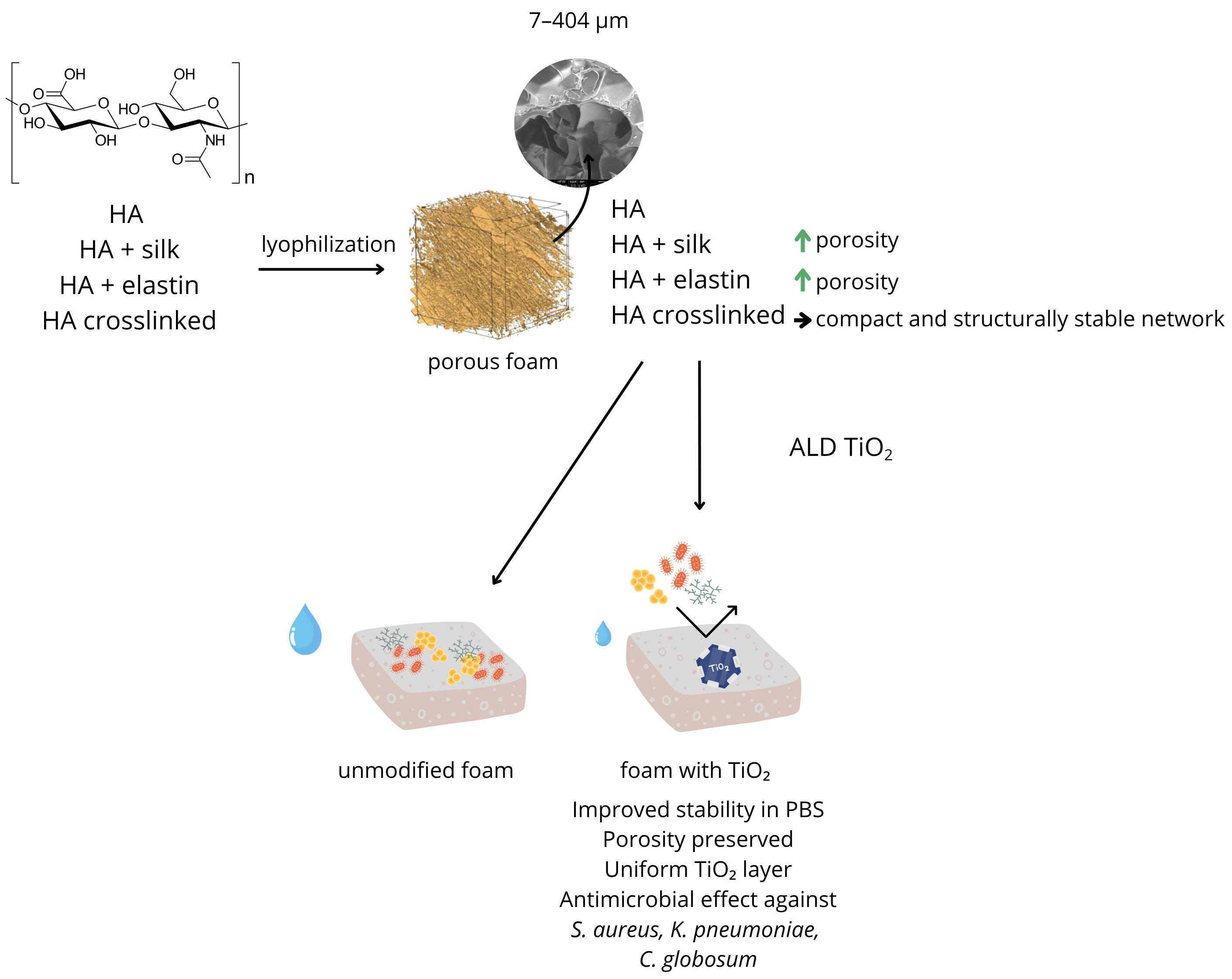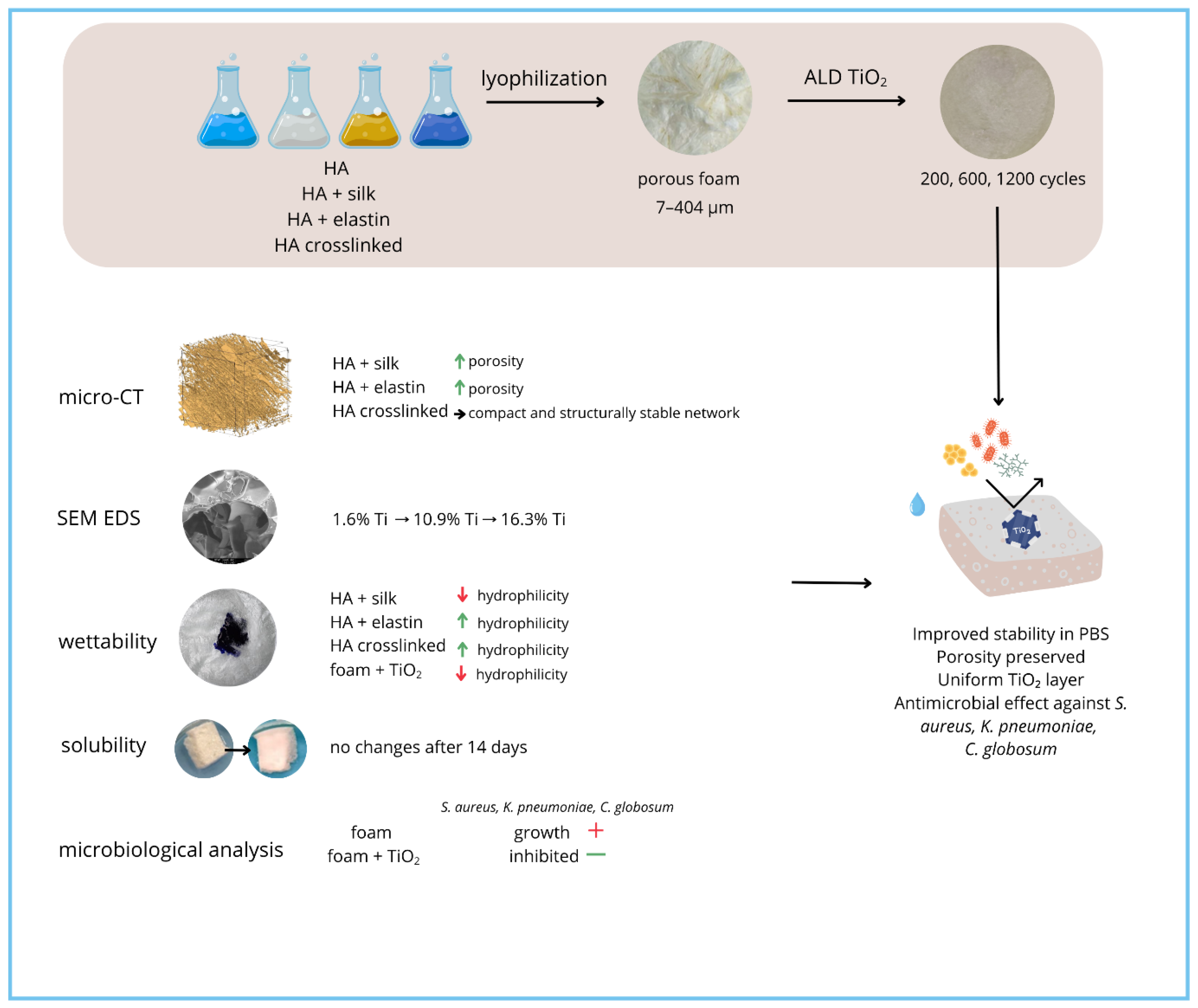 Pabjańczyk-Wlazło, E.; Tarzyńska, N.; Bednarowicz, A.; Puszkarz, A.K.; Szparaga, G.; Sztajnowski, S.; Kaczmarek, P. Surface Functionalisation of Hyaluronic Acid-Based Foams with TiO2 via ALD: Structural, Wettability and Antimicrobial Properties Analysis for Biomedical Applications. Materials 2025, 18, 5530. https://doi.org/10.3390/ma18245530