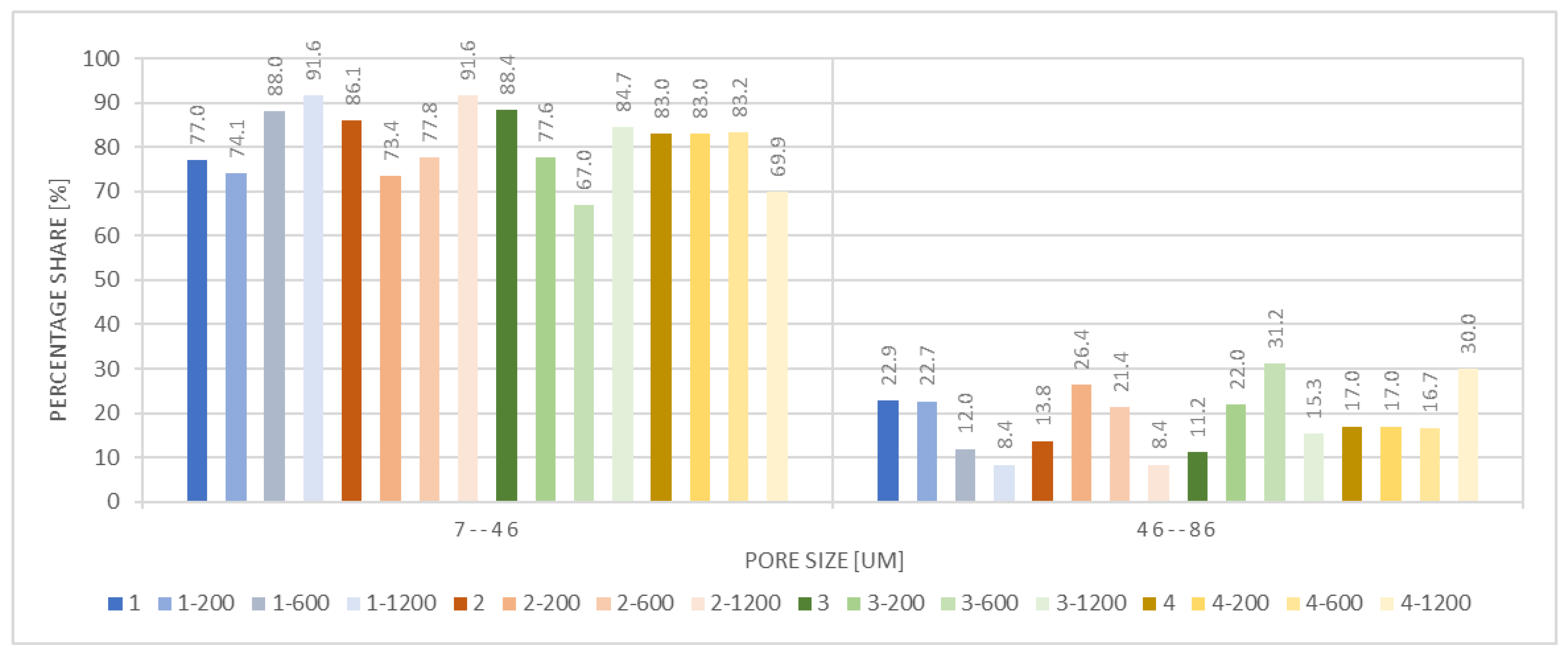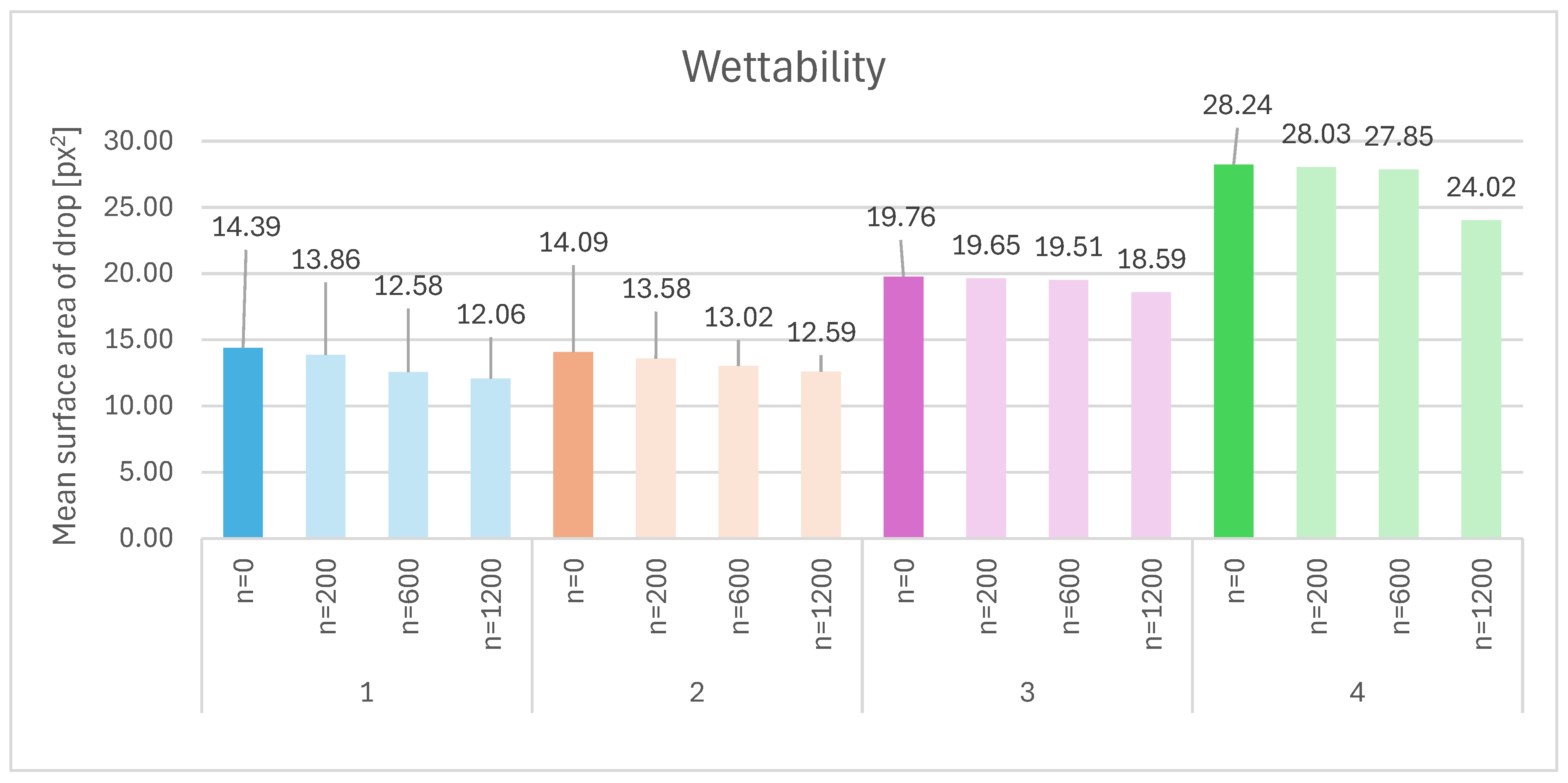 | Sample | Composition | n = 0 [px2] | n = 200 [px2] | n = 600 [px2] | n = 1200 [px2] | Δ200 vs. 0 [%] | Δ600 vs. 0 [%] | Δ1200 vs. 0 [%] | Relative to Sample 1 at n = 0 | Relative to Sample 1 at n = 1200 |