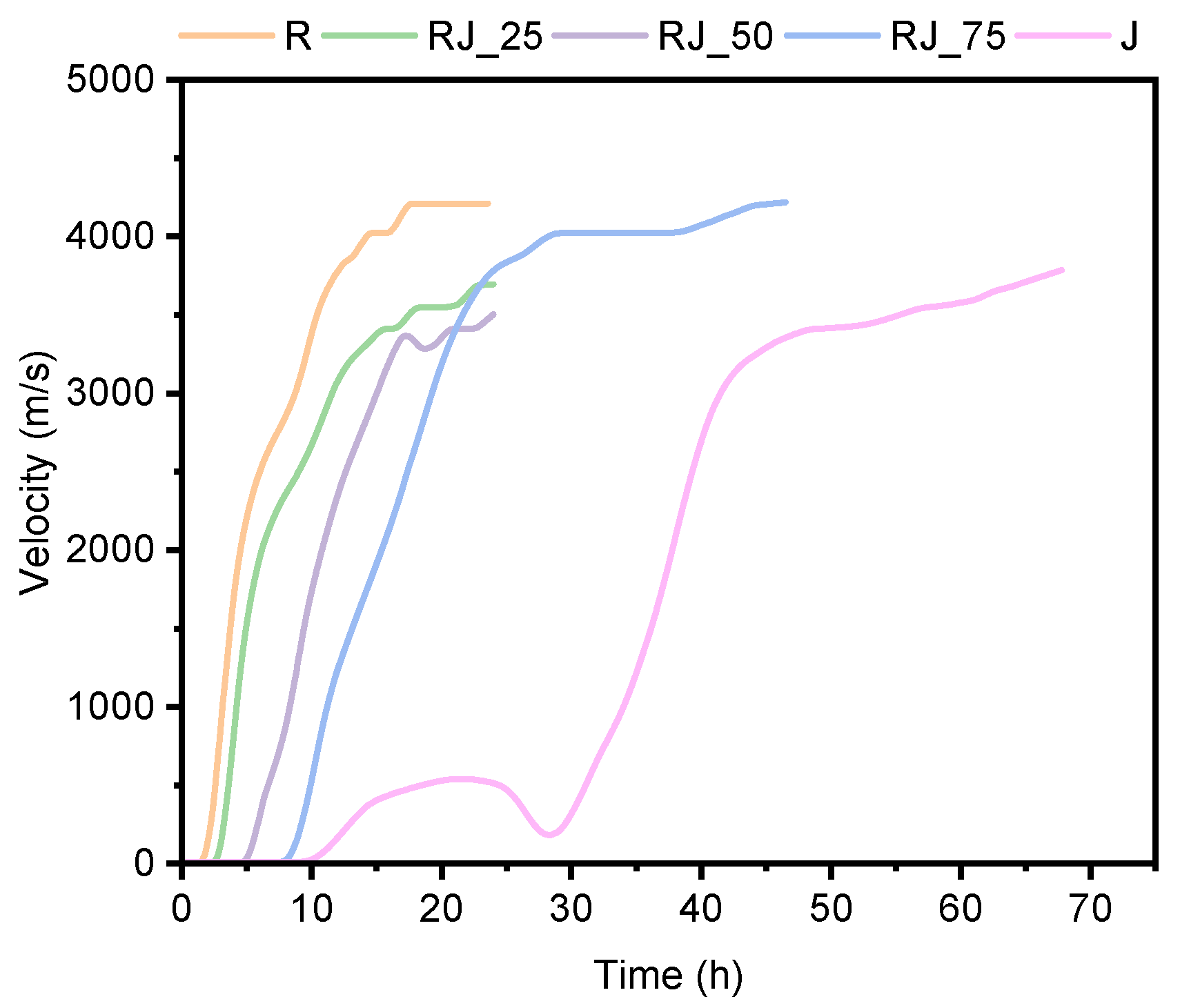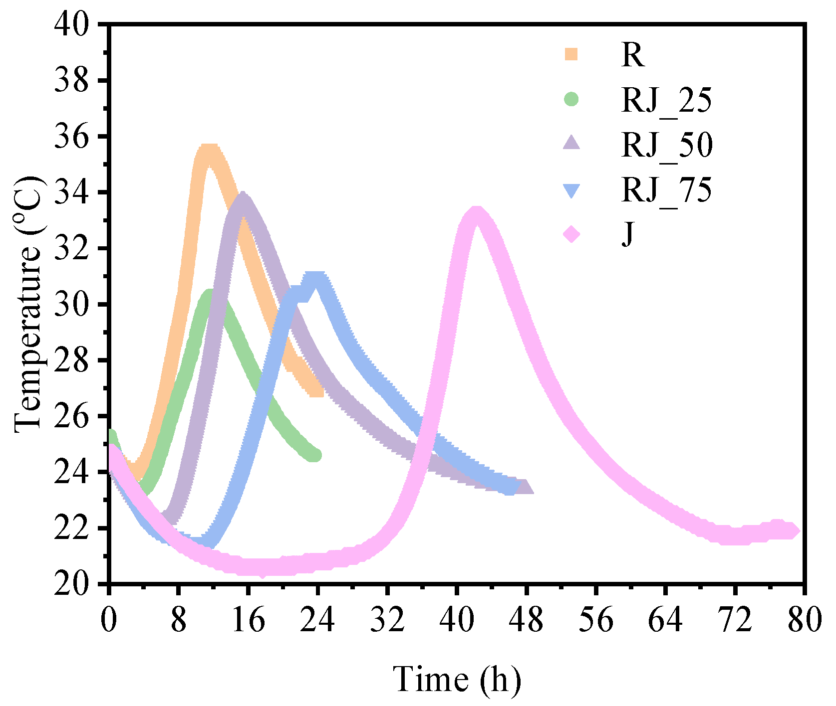 The onset of temperature rise following the dormant phase occurred at approximately 3.67 h (R), 4.17 h (RJ_25), 6.90 h (RJ_50), 12.13 h (RJ_75), and 31.45 h (J). These values differ slightly from the UPV-determined initial setting times; however, the thermal curves reliably tracked the trends in hydration delay.