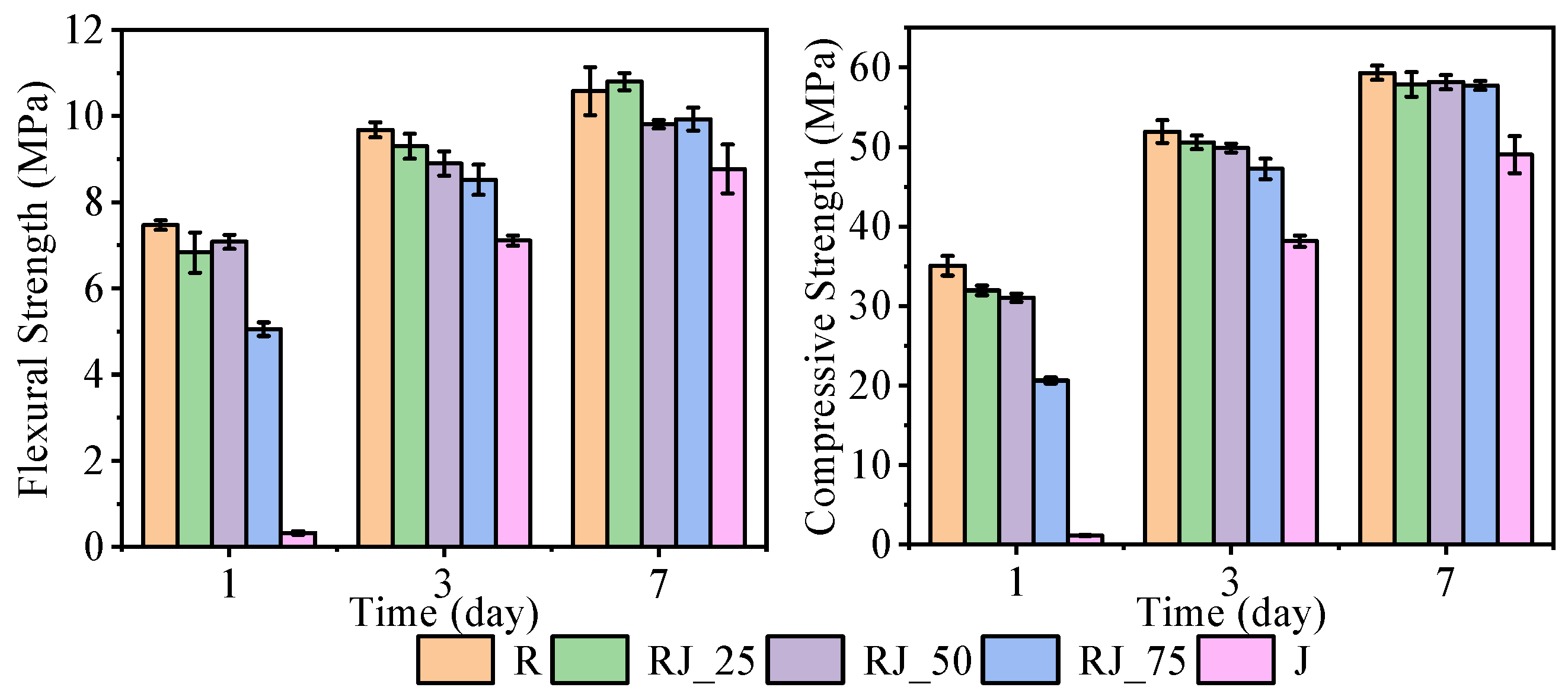 Greater differences were observed in compressive strength. After 1 day, mixture R reached 35 MPa, while RJ_25 and RJ_50 both achieved approximately 32 MPa. Mixture RJ_75 reached 20 MPa, and J was unable to withstand any compressive load at this age due to incomplete setting. After 3 days, mixtures R, RJ_25, and RJ_50 developed compressive strengths of around 50 MPa, although the strength of RJ_50 was statistically significantly lower than that of R. Mixture RJ_75 reached approximately 90% of the reference value. Mixture J exhibited the greatest delay in strength development, with strengths remaining below 40 MPa by day 3. After 7 days, all mixtures except J achieved comparable compressive strengths of about 58 MPa, while mixture J reached values close to 50 MPa.