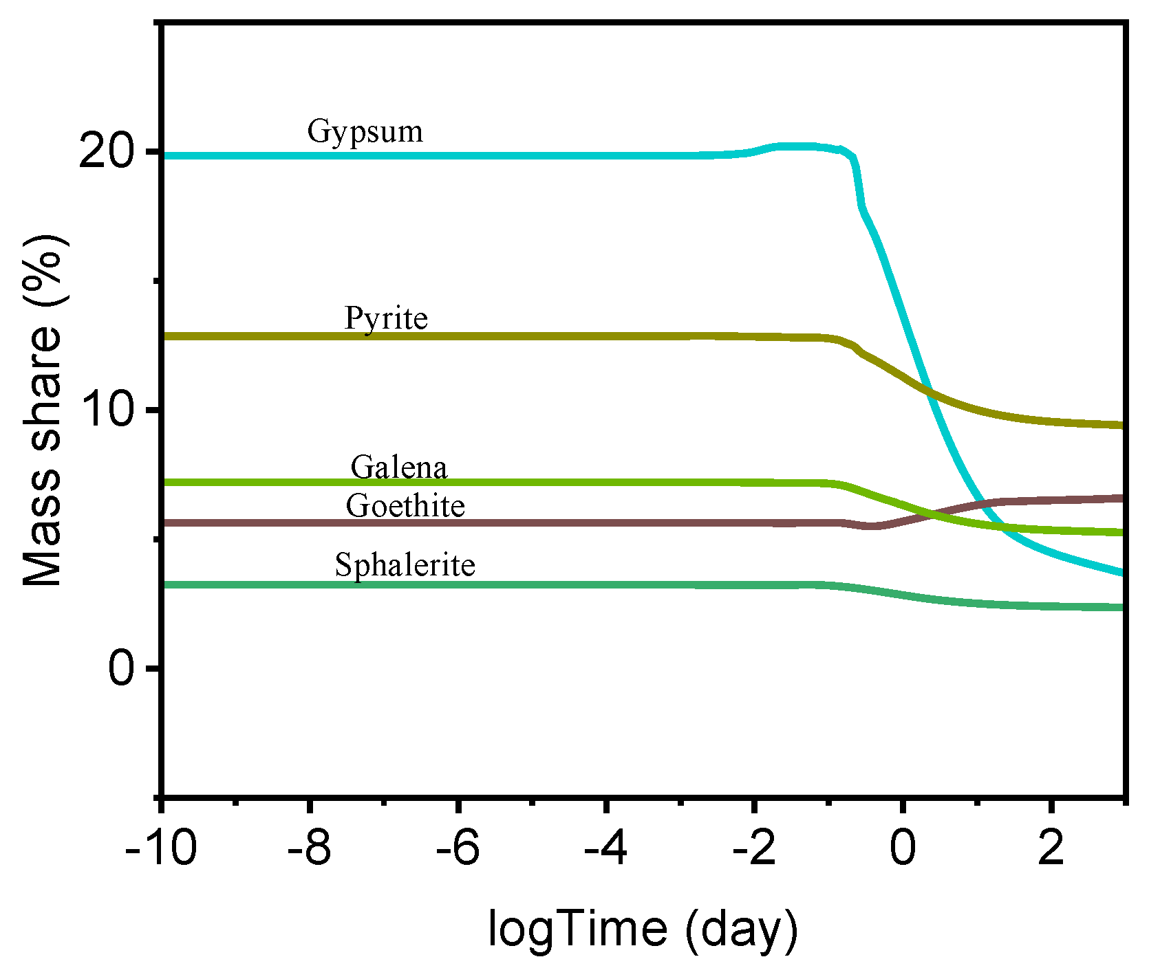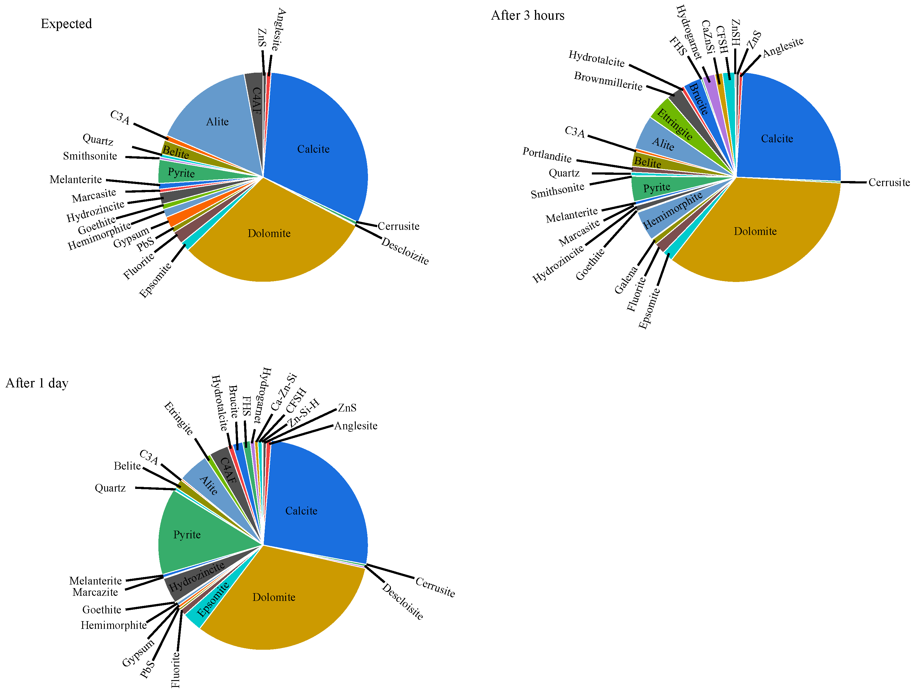 The analyses revealed that ZnS remains stable in the alkaline cementitious environment. However, after 3 h, the concentrations of hydrozincite and smithsonite decreased, while the concentration of hemimorphite increased. The reduction in smithsonite (ZnCO3) and hydrozincite alongside an increase in hemimorphite suggests that Zn2+ ions reacted with SiO32− ions released from alite dissolution. This reaction likely occurred under oxidizing conditions in the presence of galena, anglesite, and smithsonite. Complex metal silicate species—primarily containing Ca, Fe, Zn, and Si—were most abundant after the first 3 h. After 24 h, their concentrations decreased, accompanied by the formation of FeS2, gypsum, and hydrozincite. The appearance of FeS2 indicates a transition toward reducing conditions within the cement matrix.
