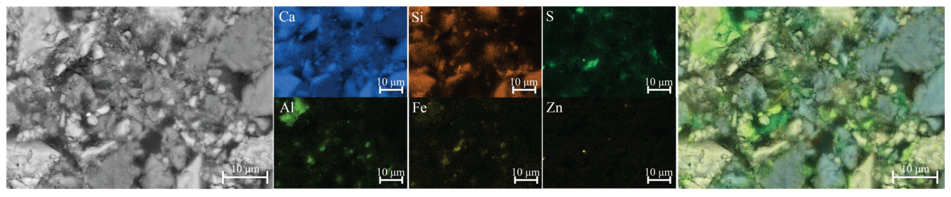 The SEM-EDS analysis of mixture J confirmed the presence of zinc-bearing species within the recycled aggregate (Figure 6). After 3 h, the microstructure was not yet developed, as visible voids between the aggregate particles and the cement matrix were still present. The lead-bearing species were mostly below the detection limit; however, traces of lead were detected within the aggregate (Figure 6).