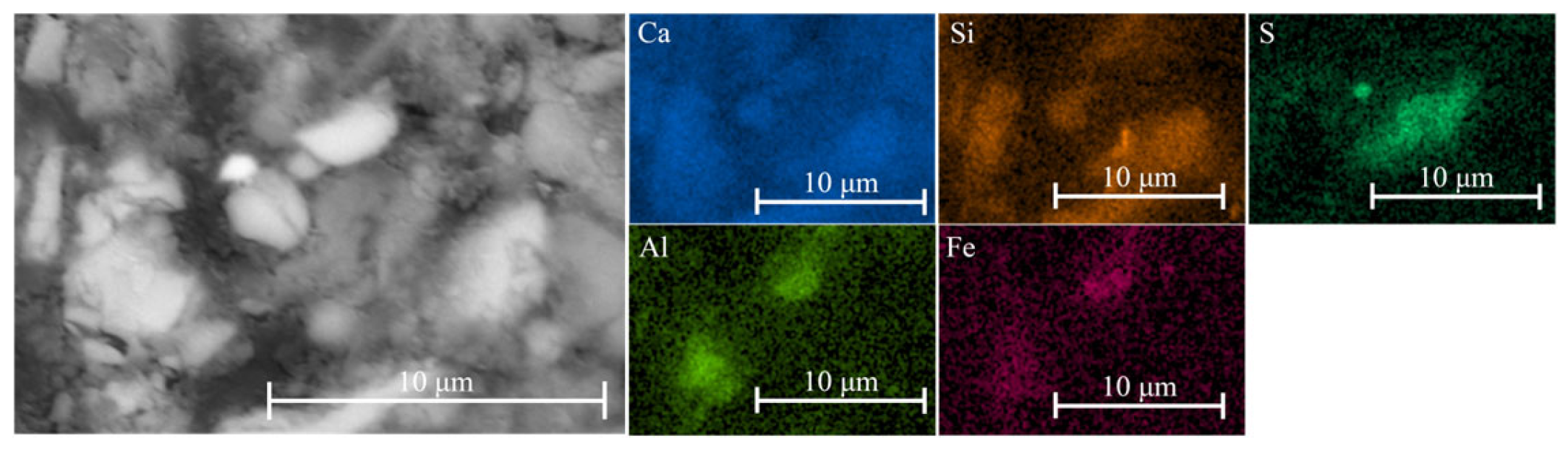 The 1-day-old sample exhibited a more consolidated microstructure (Figure 7). Localized areas enriched in sulfur and silicon were observed, indicating the formation of early hydration products and secondary phases. Phases containing lead and zinc, which are expected to form under alkaline conditions, were detected only in a few instances—most likely due to their low concentration, limited stability, or transformation into amorphous or metastable products below the EDS detection threshold. Moreover, the formation of C-Zn-S-H is most likely restricted to regions in close proximity to the ZnS particle (Figure 8). In contrast, iron–silica-rich phases were more abundant in the cementitious matrix (Figure 9), consistent with the widespread presence of iron-bearing minerals in the system.